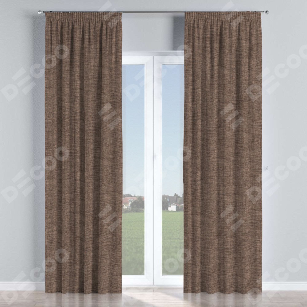 Комплект прямых штор, от производителя «Cortin», пошиты из ткани рогожка димаут коричневый, артикул ткани 91018. С изнаночной стороны в верхней части штор пристрачивается шторная лента с декоративными складками «Карандаш». Для создания элегантных складок прямые шторы шьются по стандарту с коэффициентом 1:2 (на 100 см. ширины проёма 200 см. ширины ткани).