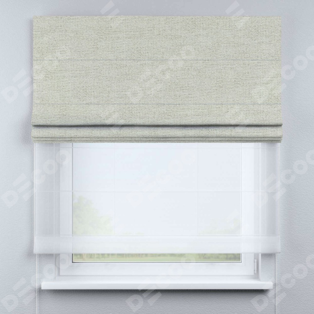 Двойная римская штора «День-ночь» от производителя Cortin предназначена для использования в проёмах. Эта штора уникальна тем, что состоит из двух полотен. На лицевой стороне находится рогожка димаут серо-бежевый (артикул: 91014), обеспечивающий эффективное затемнение. В комплект также входит вторая ткань — легкий белый тюль (артикул: V-01), который добавляет изящества и легкости оформлению окна. Кроме того, доступны и другие разновидности ткани тюль, выбор которых доступен по ссылке .