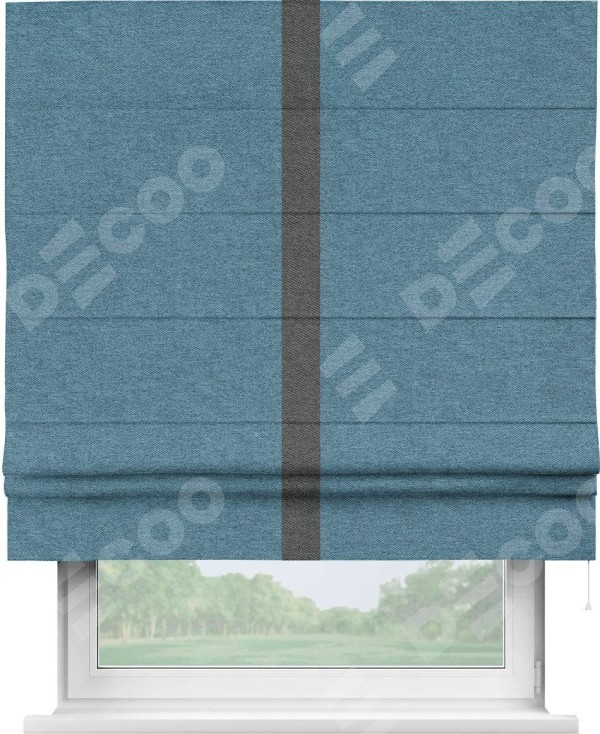Римская штора пошита из ткани твид блэкаут светло-синий, артикул: 90935, с отделкой кантом «Хайвэй» представляет собой уникальное и смелое дизайнерское решение, где кант расположен вертикально посередине шторы. Этот дизайн не только выделяет штору среди других вариантов оформления окон, но и создает интересный визуальный акцент, привлекая внимание к центру окна и разделяя штору на визуальные зоны. Такой нестандартный подход добавляет динамичности интерьеру и может быть использован для подчеркивания особенностей оформления помещения.