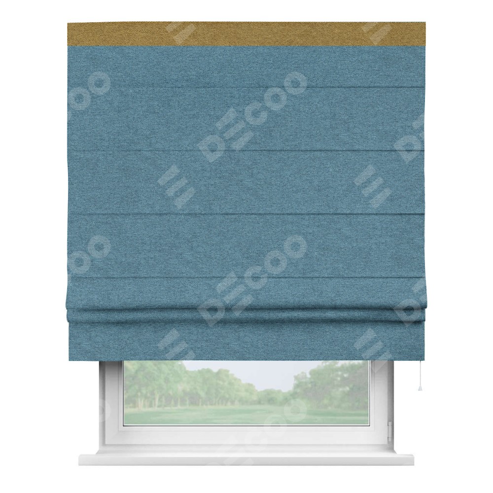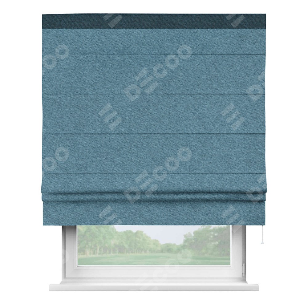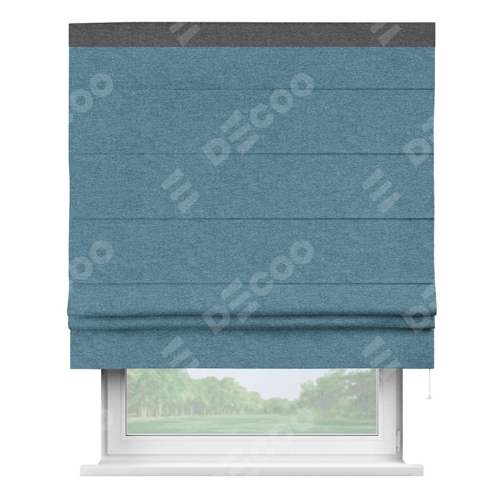 Римская штора пошита из ткани твид блэкаут светло-синий, артикул: 90935, с отделкой кантом «Кинг» отличается своей необычной особенностью: кант располагается исключительно сверху шторы. Такой дизайн делает акцент на верхней части окна, визуально поднимая потолок и придавая интерьеру более возвышенный и изысканный вид. Отделка кантом на верхней кромке не только украшает штору, но и может служить дополнительной защитой от износа в месте наибольшего контакта с механизмом управления шторой.