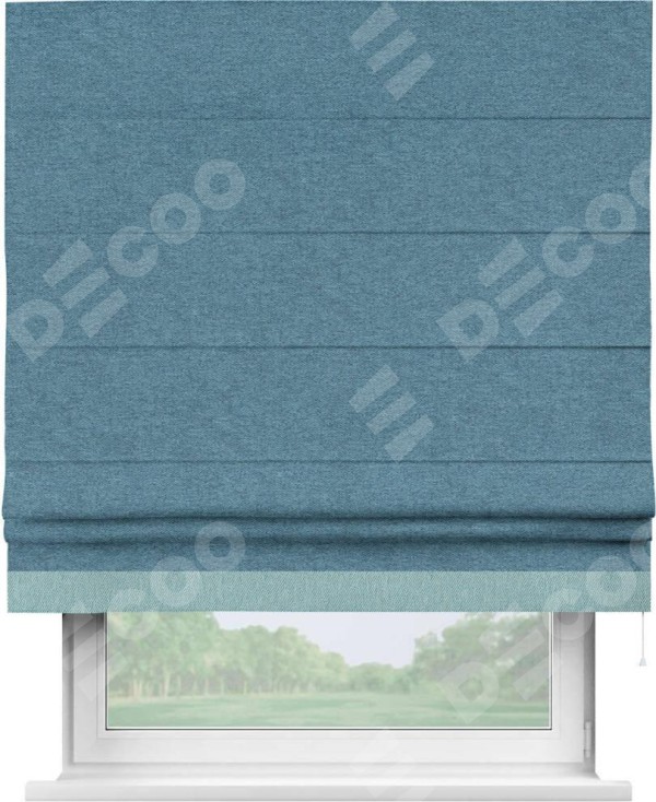 Римская штора пошита из ткани твид блэкаут светло-синий, артикул: 90935, с отделкой кантом «Джестер» выделяется своей уникальной особенностью — кантом, расположенным только снизу шторы. Этот дизайн добавляет оригинальности и игривости оконному оформлению, делая акцент на нижней части шторы и создавая интересный визуальный эффект. Отделка кантом на нижнем крае не только служит эстетической функции, но и способствует увеличению прочности и износостойкости ткани в этом месте.