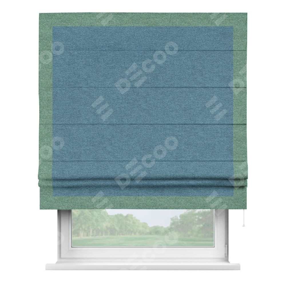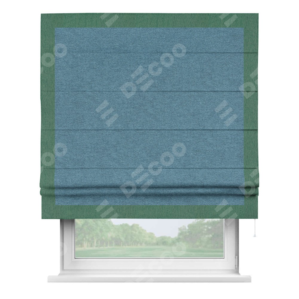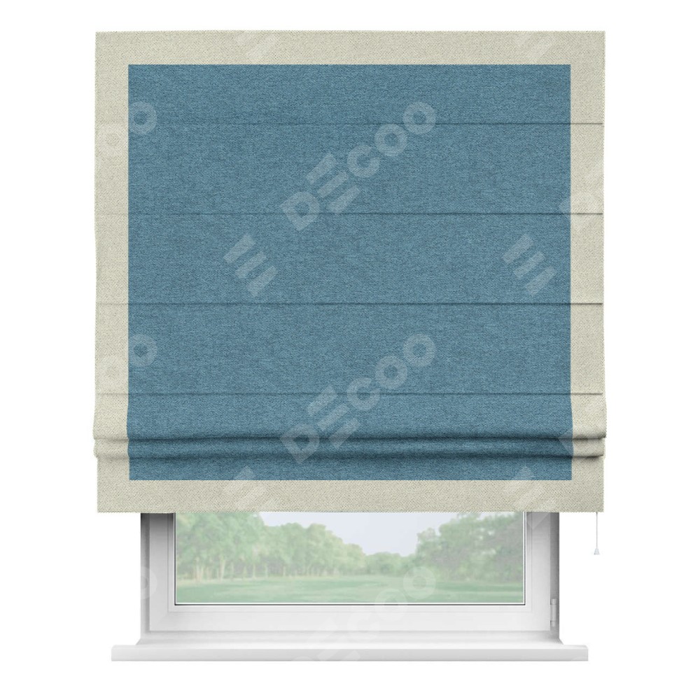 Римская штора пошита из ткани твид блэкаут светло-синий, артикул: 90935, с отделкой кантом «Чесс» отличается своей уникальной деталью — наличием канта не только по бокам и снизу, но и сверху по всем краям шторы. Это придает шторе особенно аккуратный и завершенный вид, делая акцент на границах и форме шторы. Отделка кантом по всему периметру шторы усиливает её декоративные качества и подчеркивает строгую геометрию, что может быть особенно актуально для современных и минималистичных интерьеров.