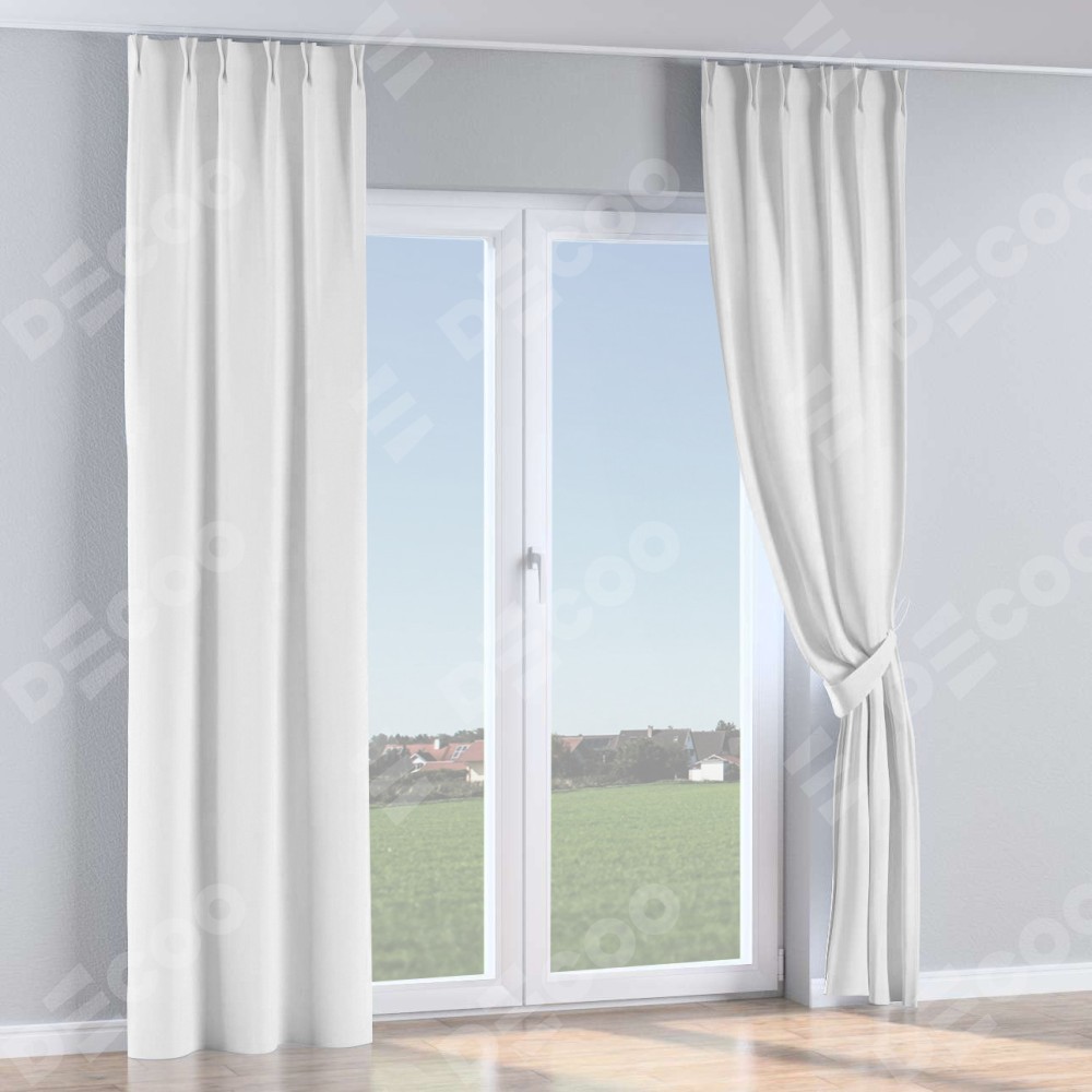 Комплект прямых штор, от производителя «Cortin», пошиты из ткани лён белоснежный, артикул ткани 95632. С изнаночной стороны в верхней части штор пристрачивается шторная лента с декоративными складками «Кустик». Для создания элегантных складок прямые шторы шьются по стандарту с коэффициентом 1:2 (на 100 см. ширины проёма 200 см. ширины ткани).