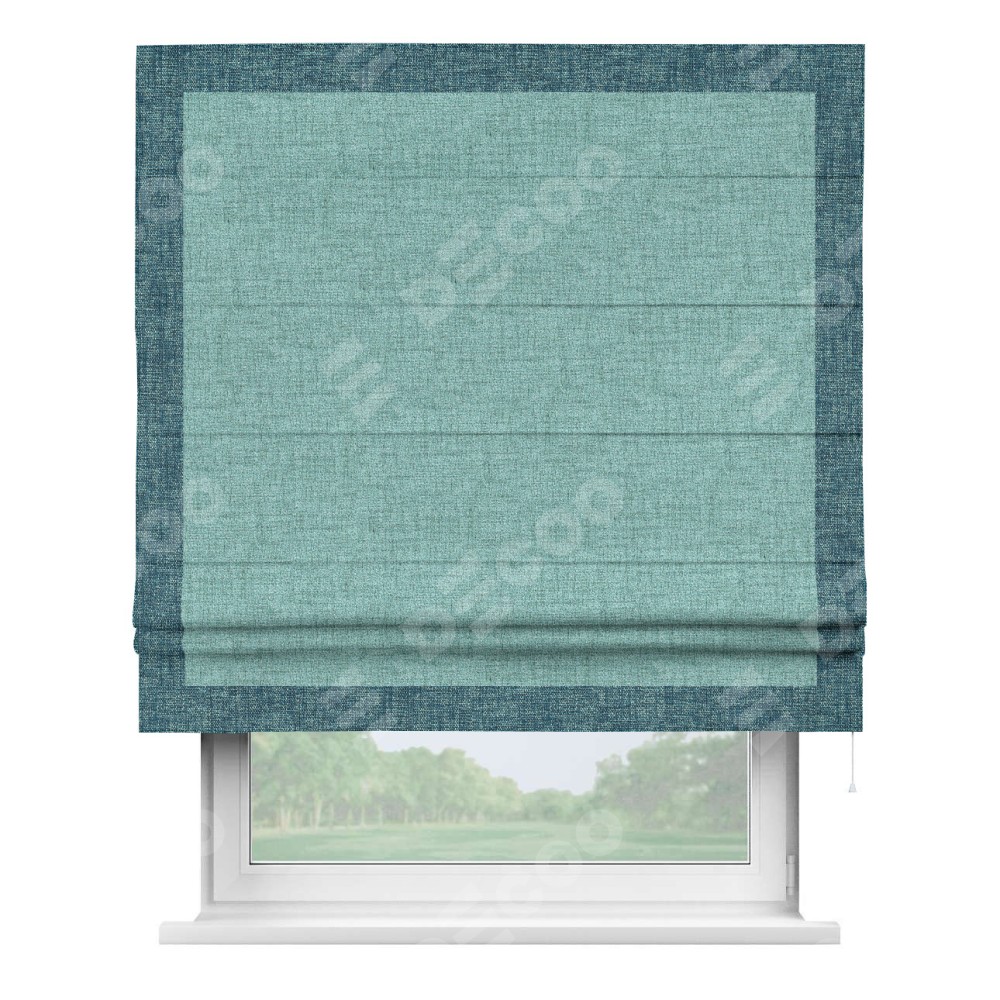 Римская штора «Кортин» для проёма, рогожка димаут аквамариновый крайола, с кантом Чесс