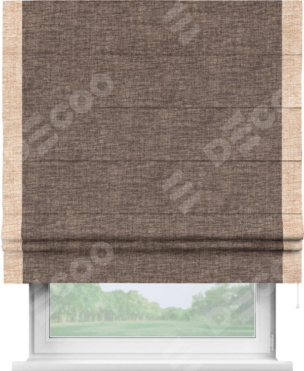 Римская штора пошита из ткани рогожка димаут коричневый, артикул: 91018, с отделкой кантом «Стрим Дуо» выделяется наличием кантов по обоим бокам шторы, слева и справа. Этот дизайн придает шторе аккуратный и завершенный вид, акцентируя вертикальные линии и визуально вытягивая окно в высоту. Отделка кантом по бокам не только украшает штору, но и служит практической функцией, укрепляя края и продлевая срок службы изделия.