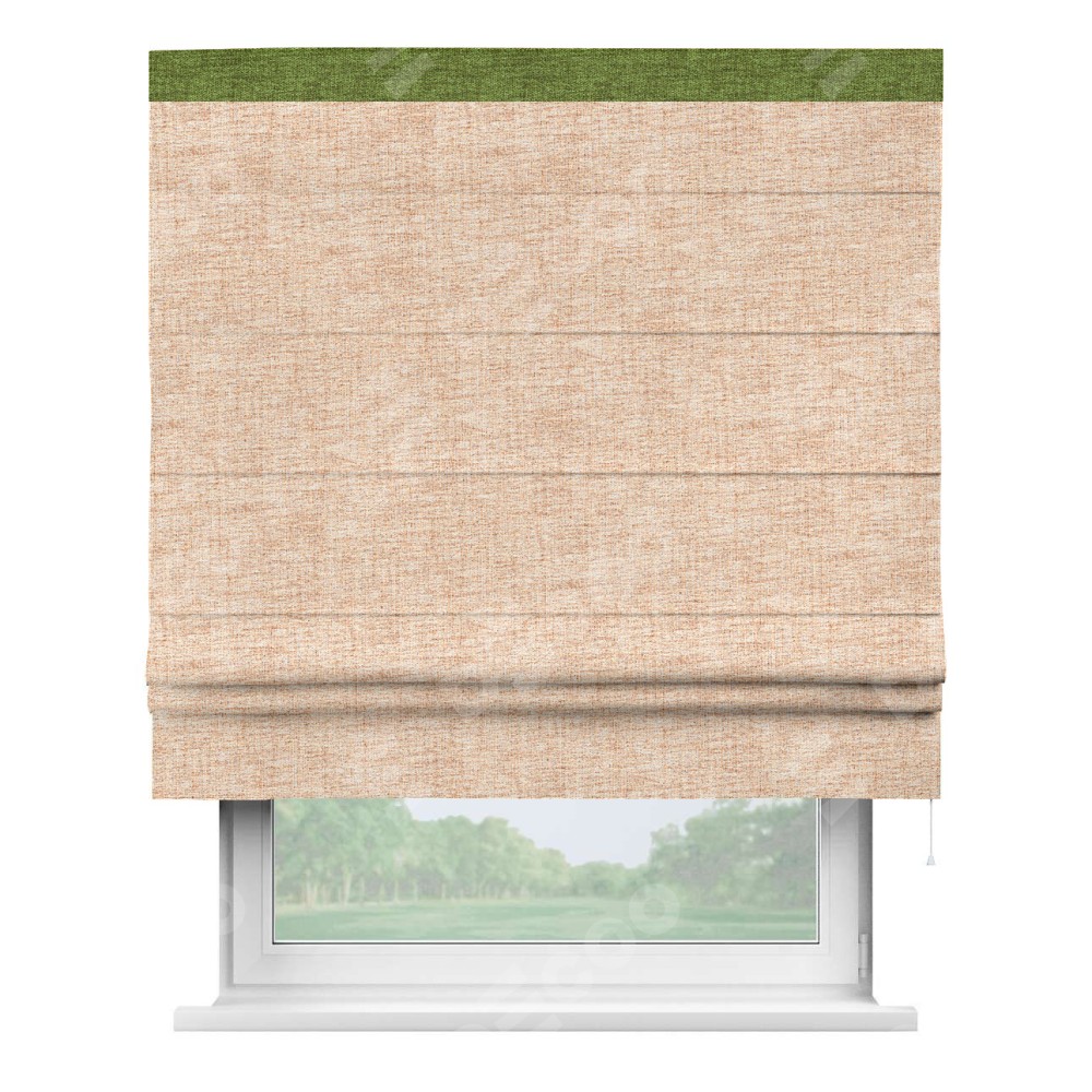 Римская штора пошита из ткани рогожка димаут персиковый, артикул: 91016, с отделкой кантом «Кинг» отличается своей необычной особенностью: кант располагается исключительно сверху шторы. Такой дизайн делает акцент на верхней части окна, визуально поднимая потолок и придавая интерьеру более возвышенный и изысканный вид. Отделка кантом на верхней кромке не только украшает штору, но и может служить дополнительной защитой от износа в месте наибольшего контакта с механизмом управления шторой.