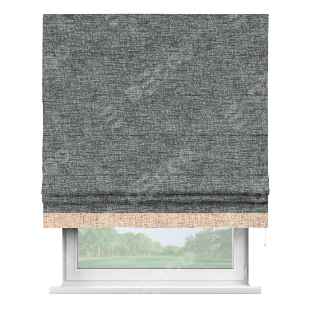 Римская штора пошита из ткани рогожка димаут тёмно-серый, артикул: 91029, с отделкой кантом «Джестер» выделяется своей уникальной особенностью — кантом, расположенным только снизу шторы. Этот дизайн добавляет оригинальности и игривости оконному оформлению, делая акцент на нижней части шторы и создавая интересный визуальный эффект. Отделка кантом на нижнем крае не только служит эстетической функции, но и способствует увеличению прочности и износостойкости ткани в этом месте.