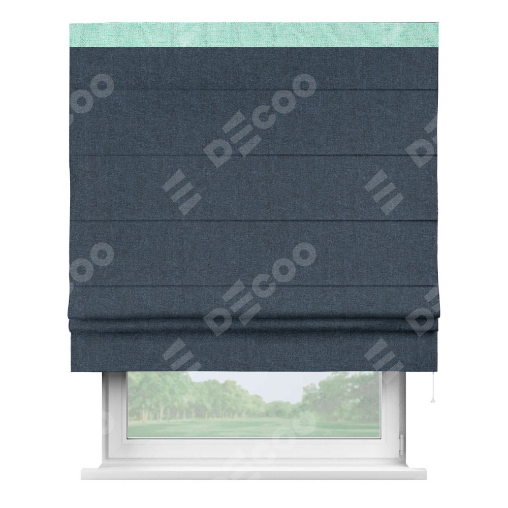 Римская штора пошита из ткани лён кашемир синий, артикул: 21623, с отделкой кантом «Кинг» отличается своей необычной особенностью: кант располагается исключительно сверху шторы. Такой дизайн делает акцент на верхней части окна, визуально поднимая потолок и придавая интерьеру более возвышенный и изысканный вид. Отделка кантом на верхней кромке не только украшает штору, но и может служить дополнительной защитой от износа в месте наибольшего контакта с механизмом управления шторой.