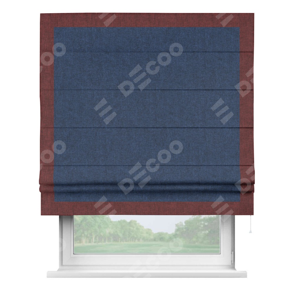 Римская штора пошита из ткани лён кашемир тёмно-синий, артикул: 17215, с отделкой кантом «Чесс» отличается своей уникальной деталью — наличием канта не только по бокам и снизу, но и сверху по всем краям шторы. Это придает шторе особенно аккуратный и завершенный вид, делая акцент на границах и форме шторы. Отделка кантом по всему периметру шторы усиливает её декоративные качества и подчеркивает строгую геометрию, что может быть особенно актуально для современных и минималистичных интерьеров.