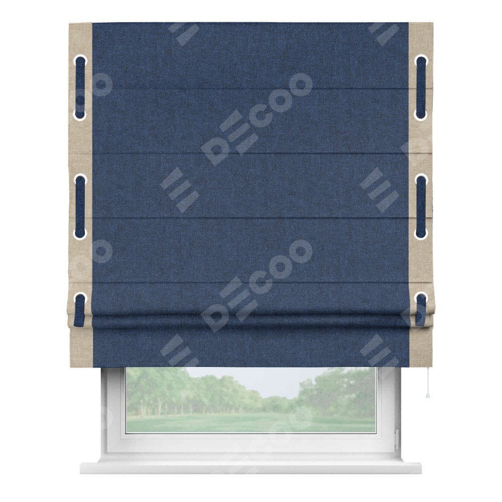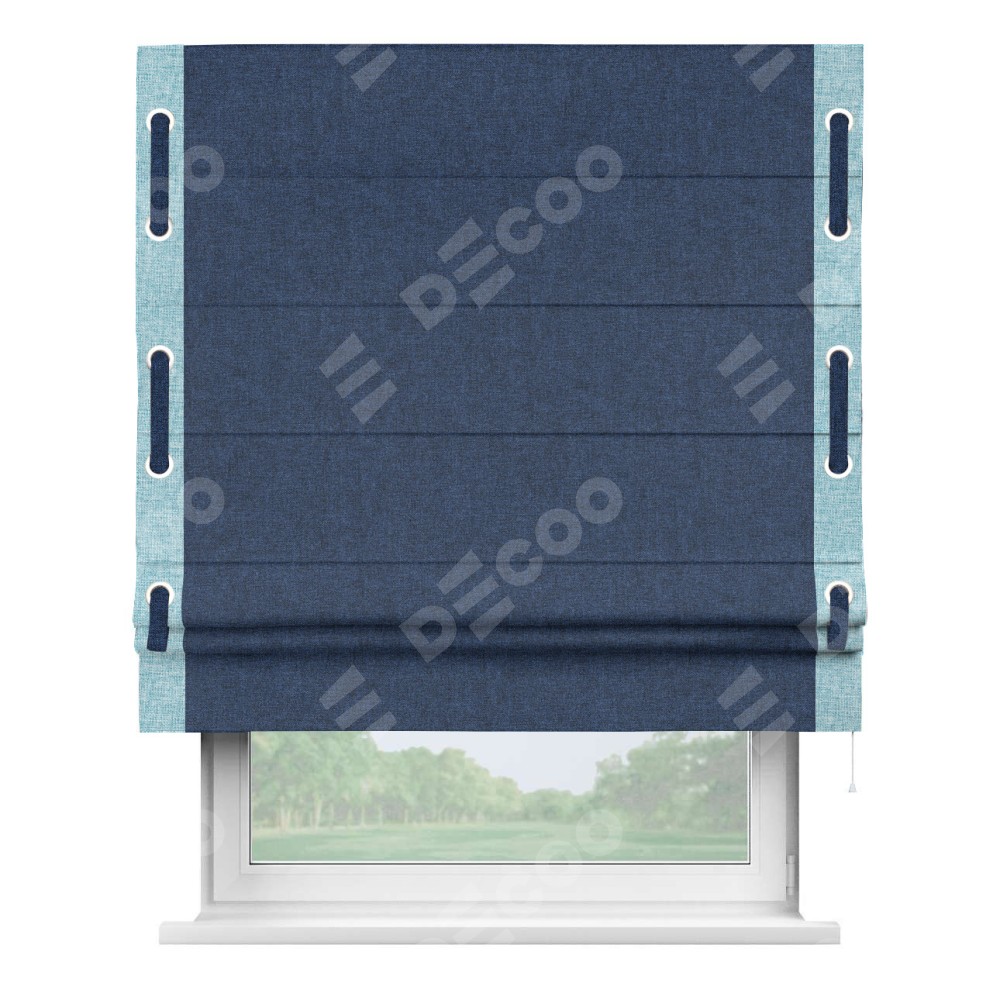 Римская штора «Кортин» для проёма, лён кашемир тёмно-синий, с кантом Стрим Дуо (люверсы с пояском)