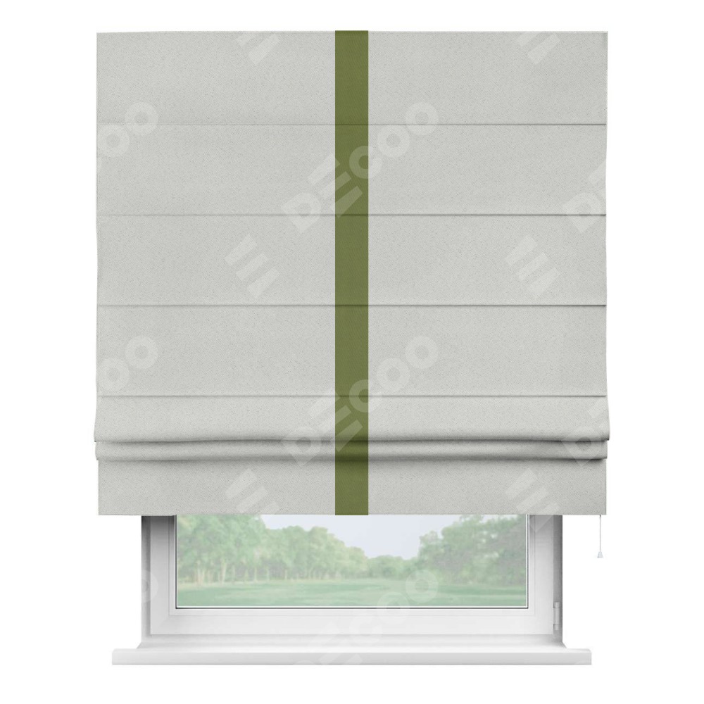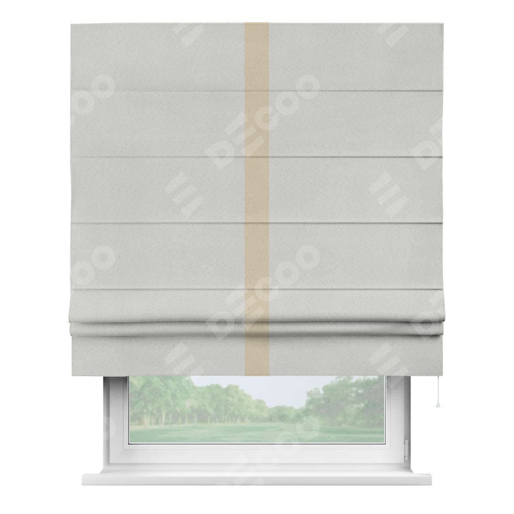 Римская штора пошита из ткани однотонный блэкаут милк, артикул: 23, с отделкой кантом «Хайвэй» представляет собой уникальное и смелое дизайнерское решение, где кант расположен вертикально посередине шторы. Этот дизайн не только выделяет штору среди других вариантов оформления окон, но и создает интересный визуальный акцент, привлекая внимание к центру окна и разделяя штору на визуальные зоны. Такой нестандартный подход добавляет динамичности интерьеру и может быть использован для подчеркивания особенностей оформления помещения.