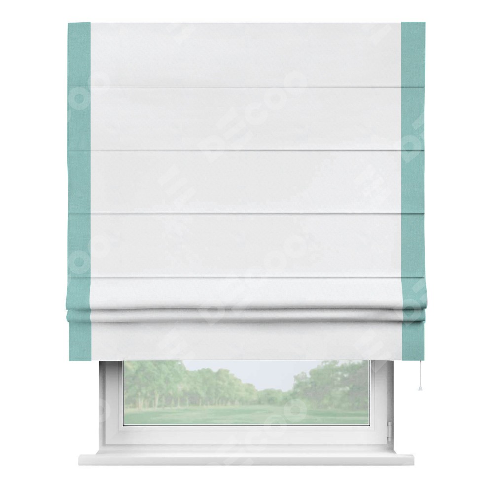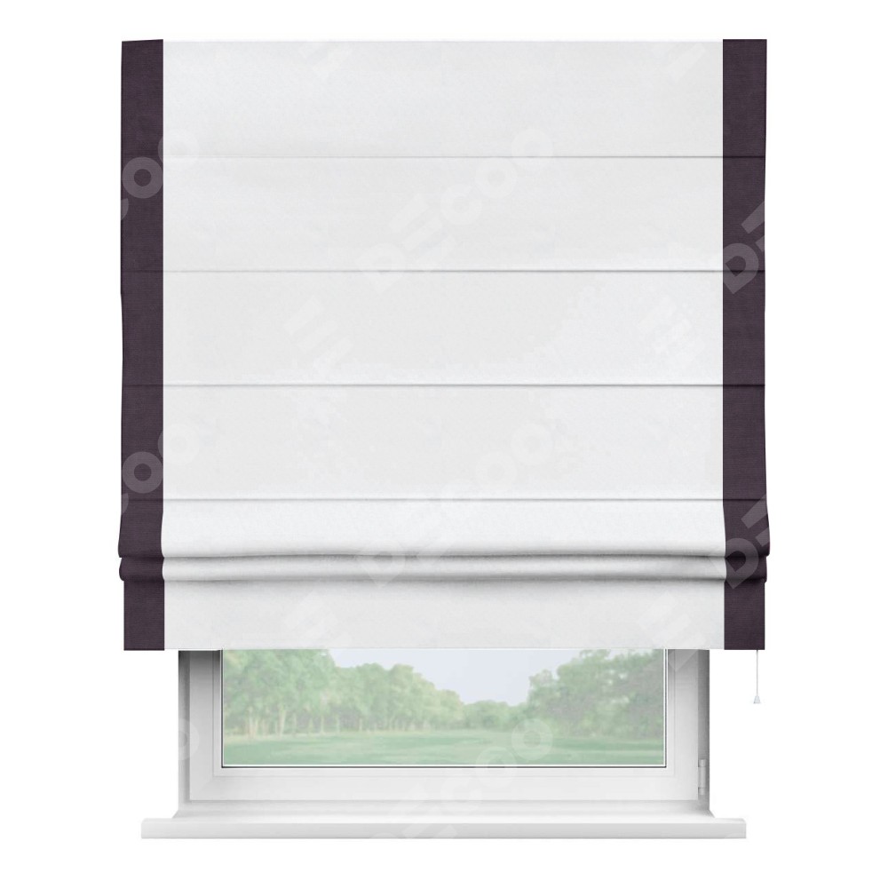 Римская штора пошита из ткани вельвет белоснежный, артикул: 92698, с отделкой кантом «Стрим Дуо» выделяется наличием кантов по обоим бокам шторы, слева и справа. Этот дизайн придает шторе аккуратный и завершенный вид, акцентируя вертикальные линии и визуально вытягивая окно в высоту. Отделка кантом по бокам не только украшает штору, но и служит практической функцией, укрепляя края и продлевая срок службы изделия.