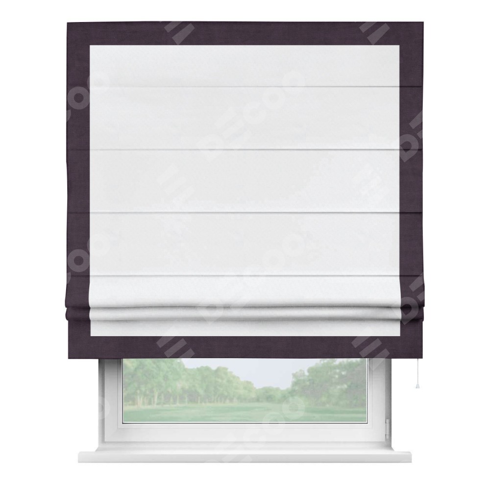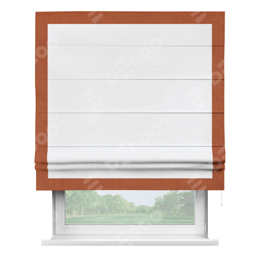 Римская штора пошита из ткани вельвет белоснежный, артикул: 92698, с отделкой кантом «Чесс» отличается своей уникальной деталью — наличием канта не только по бокам и снизу, но и сверху по всем краям шторы. Это придает шторе особенно аккуратный и завершенный вид, делая акцент на границах и форме шторы. Отделка кантом по всему периметру шторы усиливает её декоративные качества и подчеркивает строгую геометрию, что может быть особенно актуально для современных и минималистичных интерьеров.