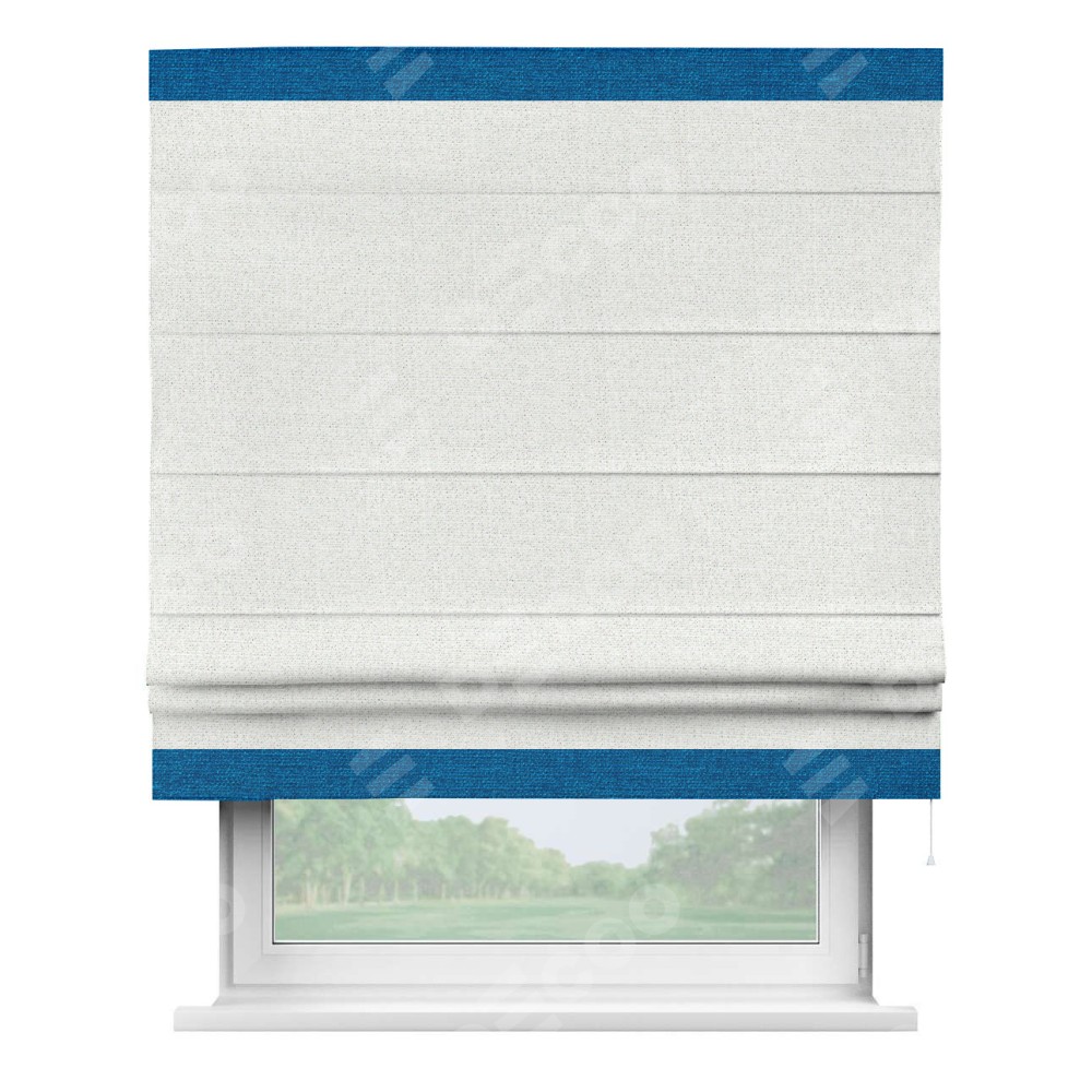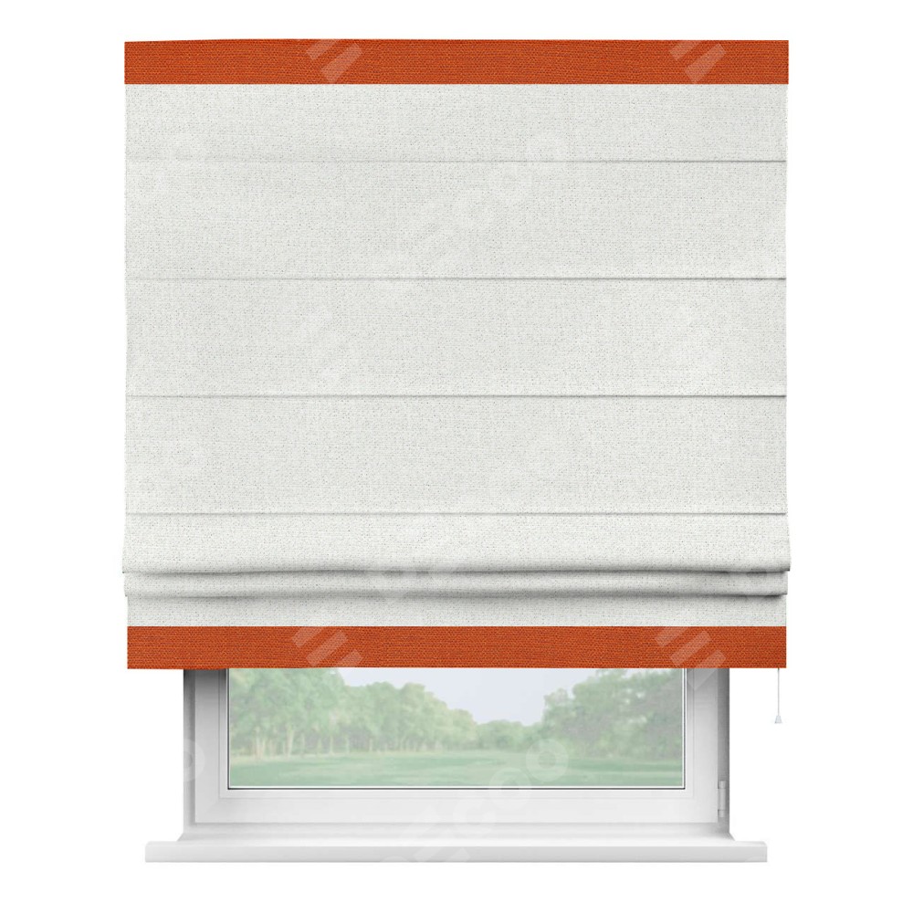 Римская штора пошита из ткани лён шампань, артикул: 91399, с отделкой кантом «Горизонт» предлагает уникальное дизайнерское решение, при котором кант располагается только вверху и снизу шторы. Такое решение делает акцент на горизонтальных линиях, визуально расширяя пространство и придавая окну более строгий и организованный вид. Отделка кантом в этих ключевых местах не только украшает штору, но и способствует её долговечности, защищая наиболее уязвимые к износу края.