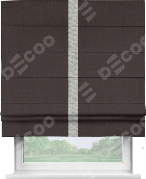 Римская штора пошита из ткани лён димаут венге, артикул: 91001, с отделкой кантом «Хайвэй» представляет собой уникальное и смелое дизайнерское решение, где кант расположен вертикально посередине шторы. Этот дизайн не только выделяет штору среди других вариантов оформления окон, но и создает интересный визуальный акцент, привлекая внимание к центру окна и разделяя штору на визуальные зоны. Такой нестандартный подход добавляет динамичности интерьеру и может быть использован для подчеркивания особенностей оформления помещения.