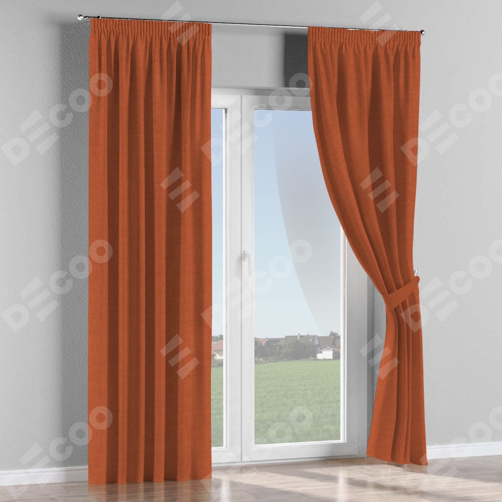 Комплект прямых штор, от производителя «Cortin», пошиты из ткани канвас терракотовый, артикул ткани v-107. С изнаночной стороны в верхней части штор пристрачивается шторная лента с декоративными складками «Карандаш». Для создания элегантных складок рекомендуемый коэффициент 1:2 (на 100 см. ширины проёма 200 см. ширины ткани). Важно! Ширина штор указана без учёта коэффициента сборки!
