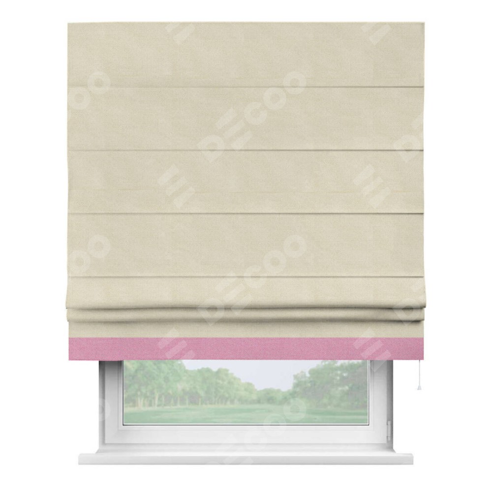 Римская штора производителя «Cortin», используется для проёма, пошита из ткани лён димаут бежевый, артикул 83023. Отделка шторы кантом «Джестер», ткань для канта используется из льна димаут разной расцветки на выбор. Имеет универсальный механизм и подходит для монтажа: на потолок, на стену и в нишу.