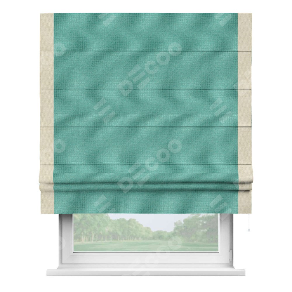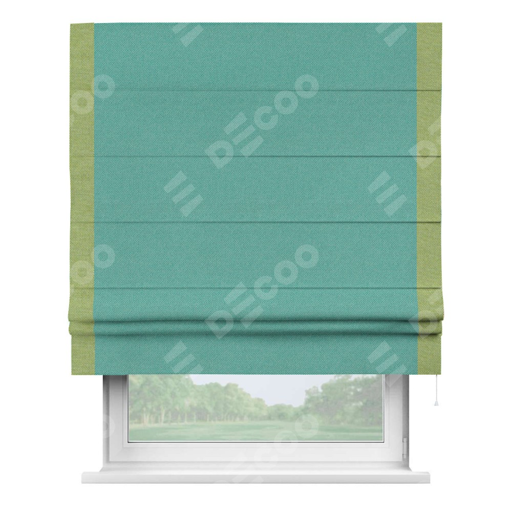 Римская штора производителя «Cortin», используется для проёма, пошита из ткани лён димаут бирюзовый, артикул 23. Отделка шторы кантом «Стрим Дуо», ткань для канта используется из льна димаут разной расцветки на выбор. Имеет универсальный механизм и подходит для монтажа: на потолок, на стену и в нишу.