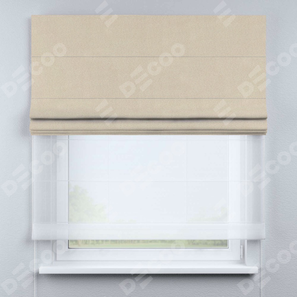 Двойная римская штора «День-ночь» от производителя Cortin предназначена для использования в проёмах. Эта штора уникальна тем, что состоит из двух полотен. На лицевой стороне находится однотонный блэкаут кофейно-бежевый (артикул: 91566−1), обеспечивающий эффективное затемнение. В комплект также входит вторая ткань — легкий белый тюль (артикул: V-01), который добавляет изящества и легкости оформлению окна. Кроме того, доступны и другие разновидности ткани тюль, выбор которых доступен по  ссылке .