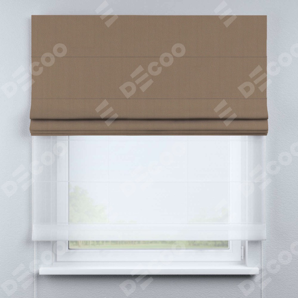 Двойная римская штора «День-ночь» от производителя Cortin предназначена для использования в проёмах. Эта штора уникальна тем, что состоит из двух полотен. На лицевой стороне находится однотонный блэкаут кофейно-бежевый (артикул: 91566−2), обеспечивающий эффективное затемнение. В комплект также входит вторая ткань — легкий белый тюль (артикул: V-01), который добавляет изящества и легкости оформлению окна. Кроме того, доступны и другие разновидности ткани тюль, выбор которых доступен по ссылке .