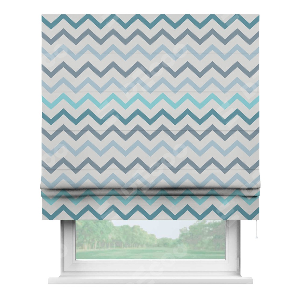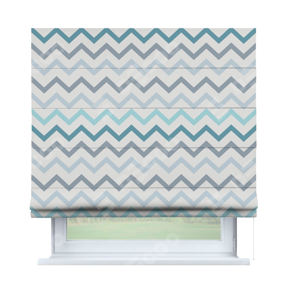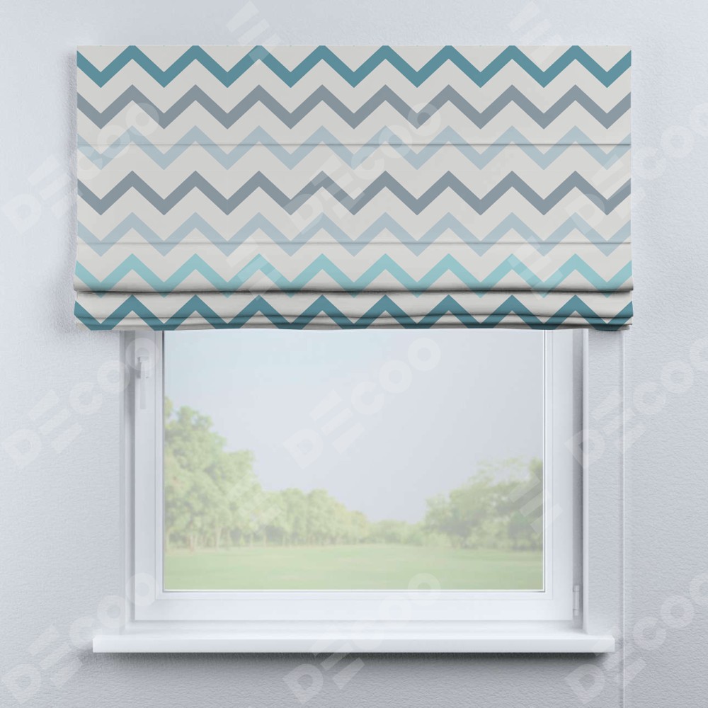 Классическая римская штора производителя «Cortin», пошита из ткани небесный шеврон, артикул:. Имеет универсальный механизм и подходит для монтажа: на потолок, на стену и в нишу.