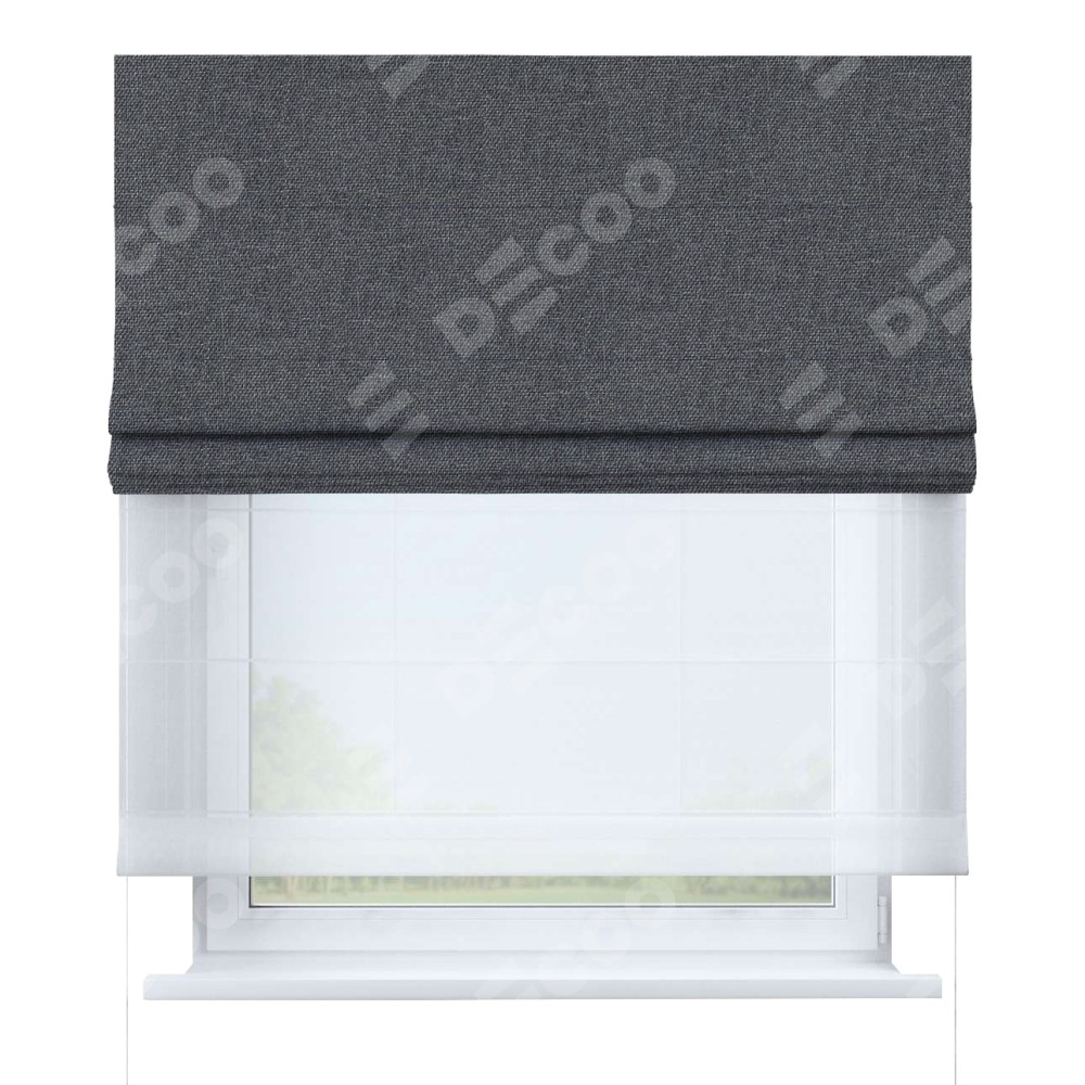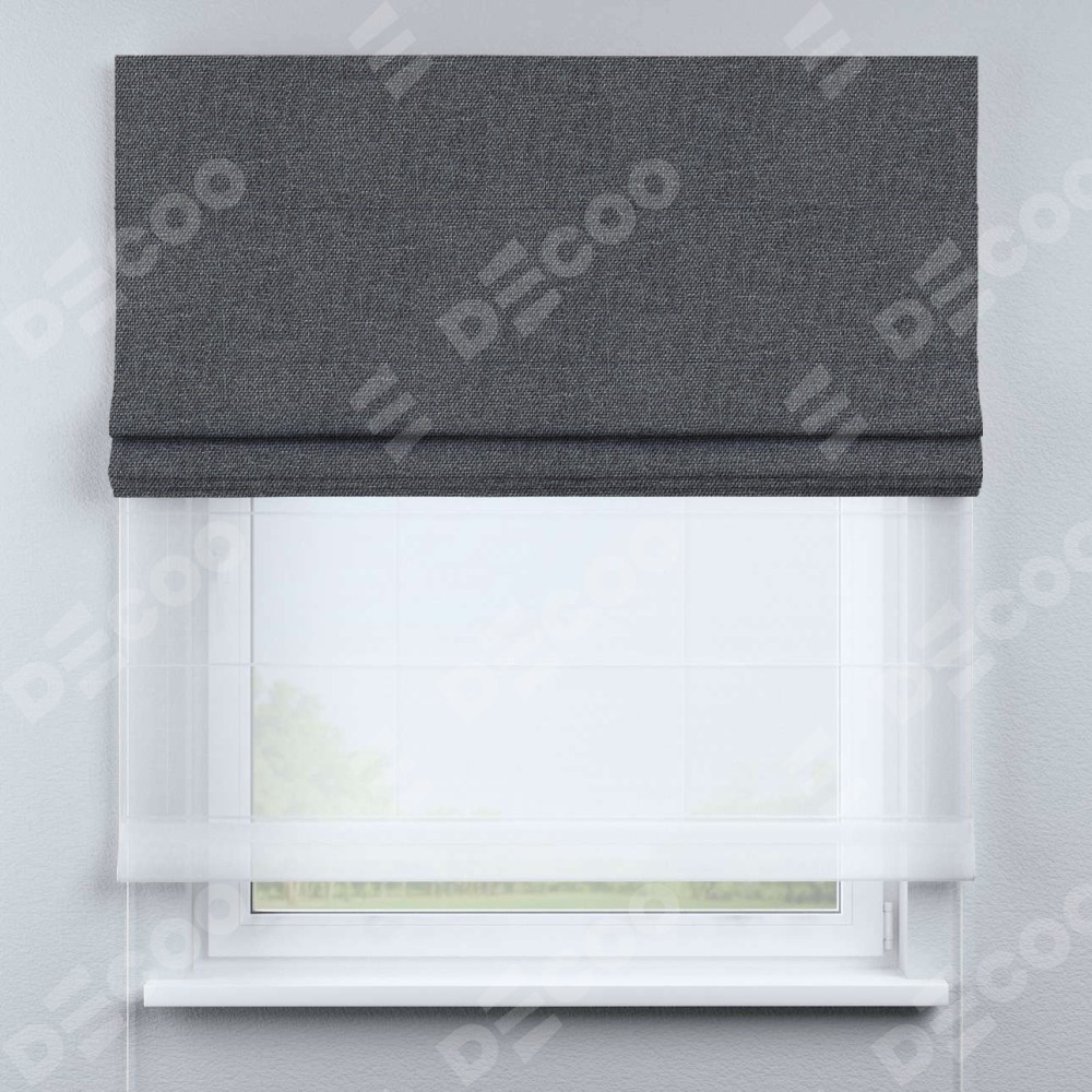 Двойная римская штора «День-ночь» от производителя Cortin предназначена для использования в проёмах. Эта штора уникальна тем, что состоит из двух полотен. На лицевой стороне находится лён димаут графит (артикул: 140644), обеспечивающий эффективное затемнение. В комплект также входит вторая ткань — легкий белый тюль (артикул: V-01), который добавляет изящества и легкости оформлению окна. Кроме того, доступны и другие разновидности ткани тюль, выбор которых доступен по  ссылке .