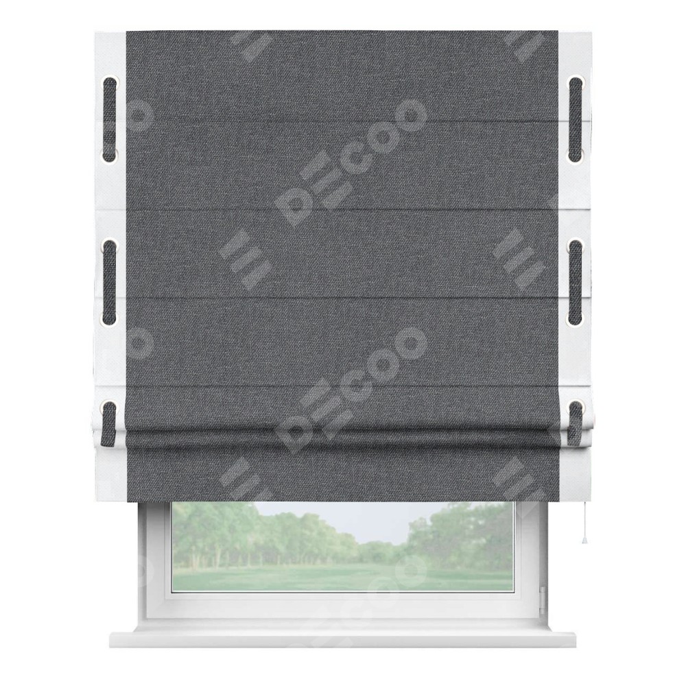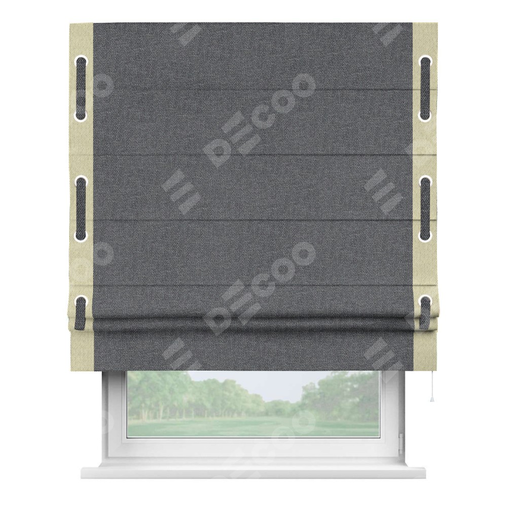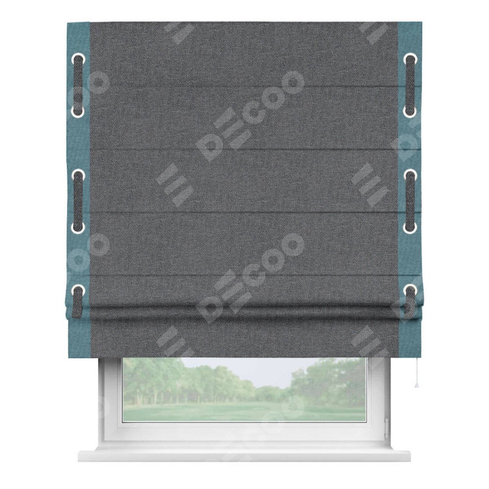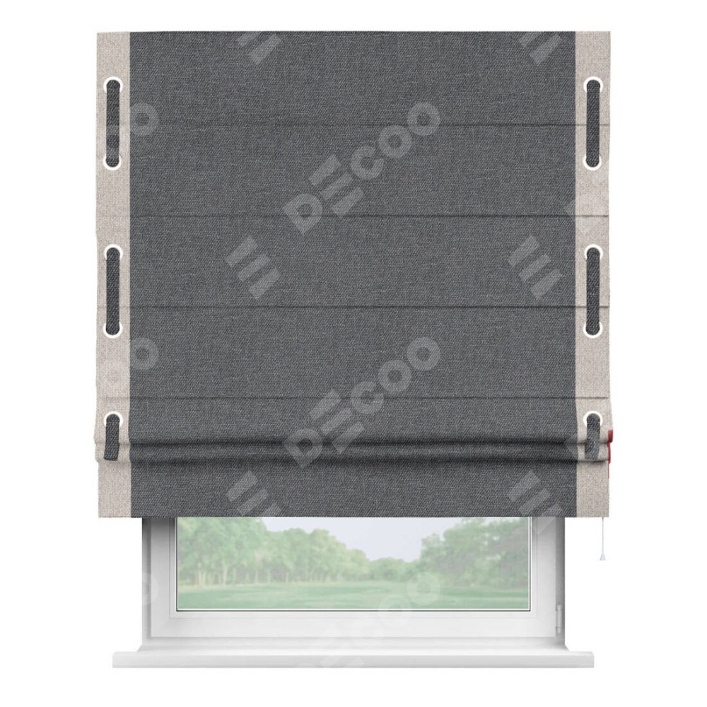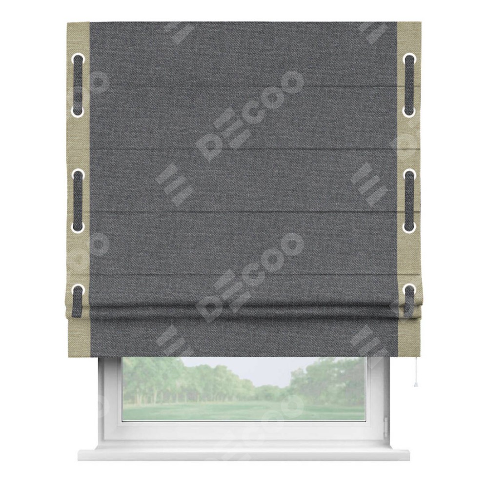 Римская штора «Кортин» для проёма, лён димаут графит с кантом Стрим Дуо (люверсы с пояском)