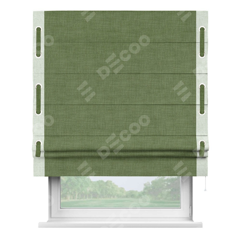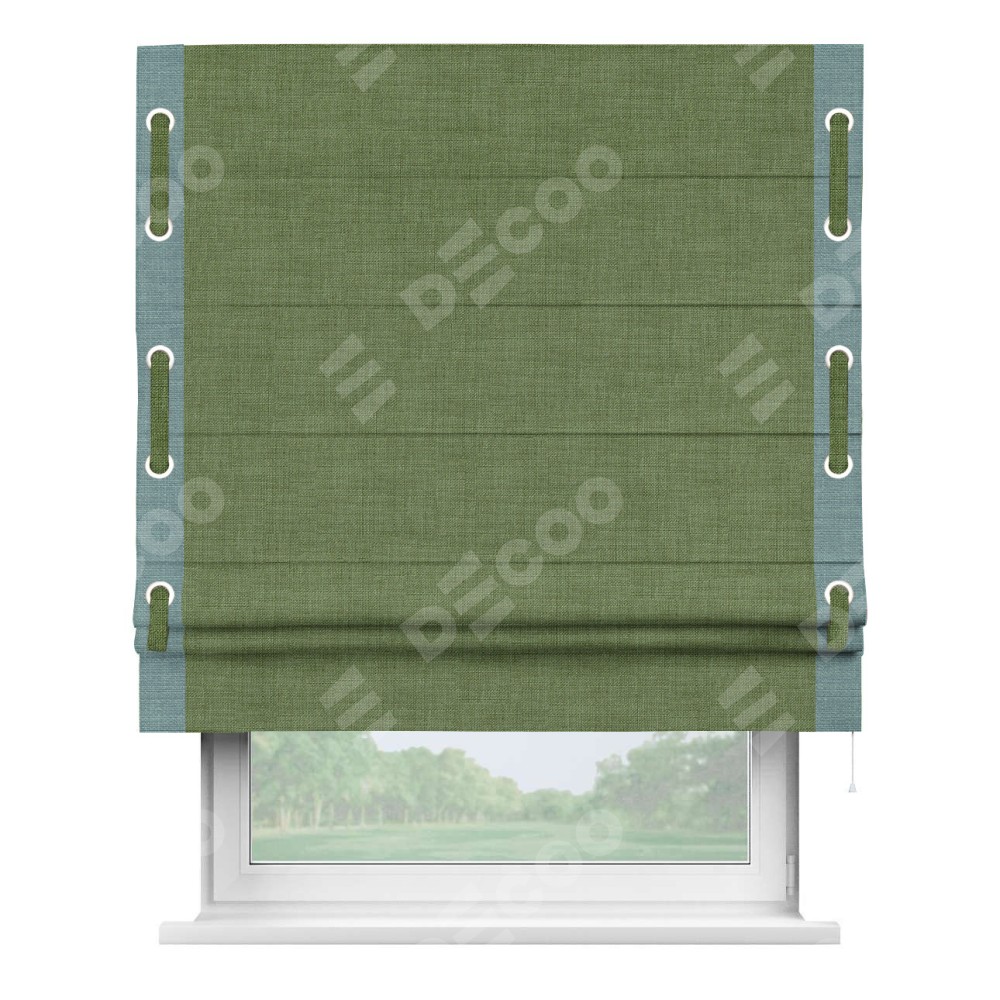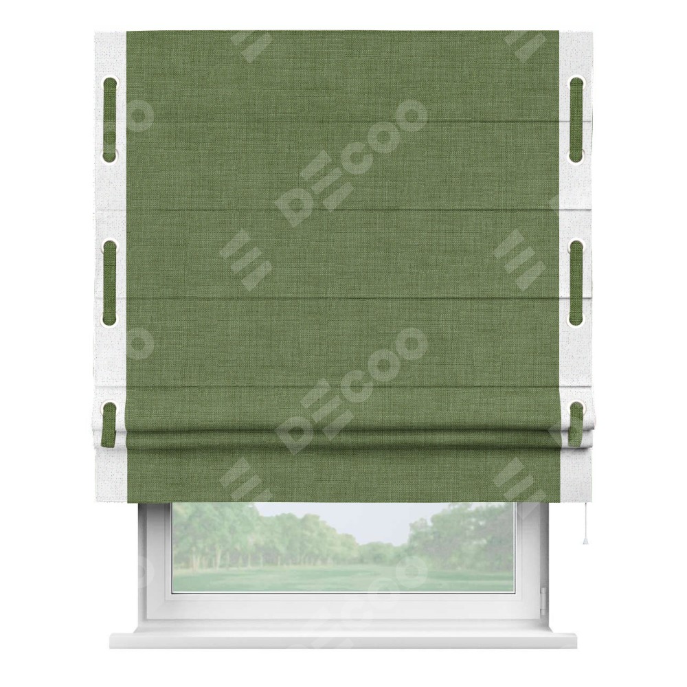 Классическая римская штора производителя «Cortin», пошита из ткани лён зелёный, артикул: 131547. Имеет универсальный механизм и подходит для монтажа: на потолок, на стену и в нишу.
