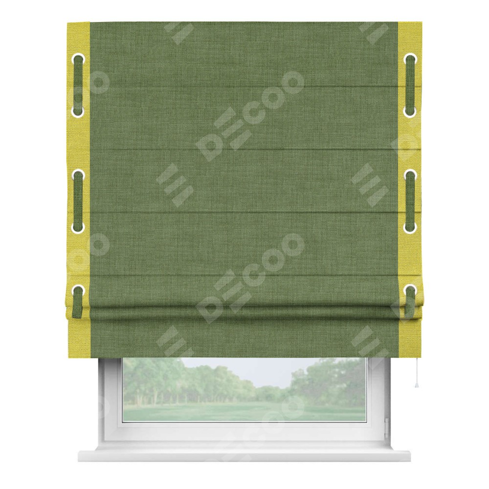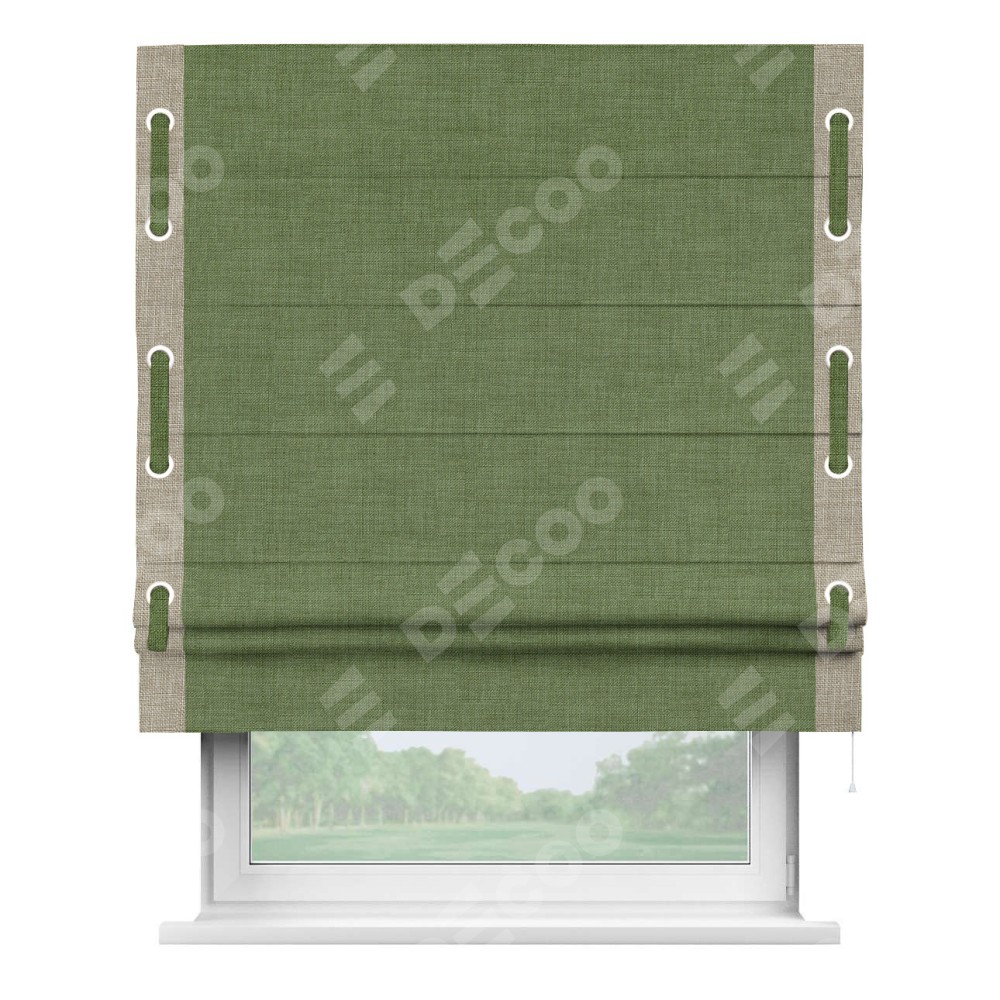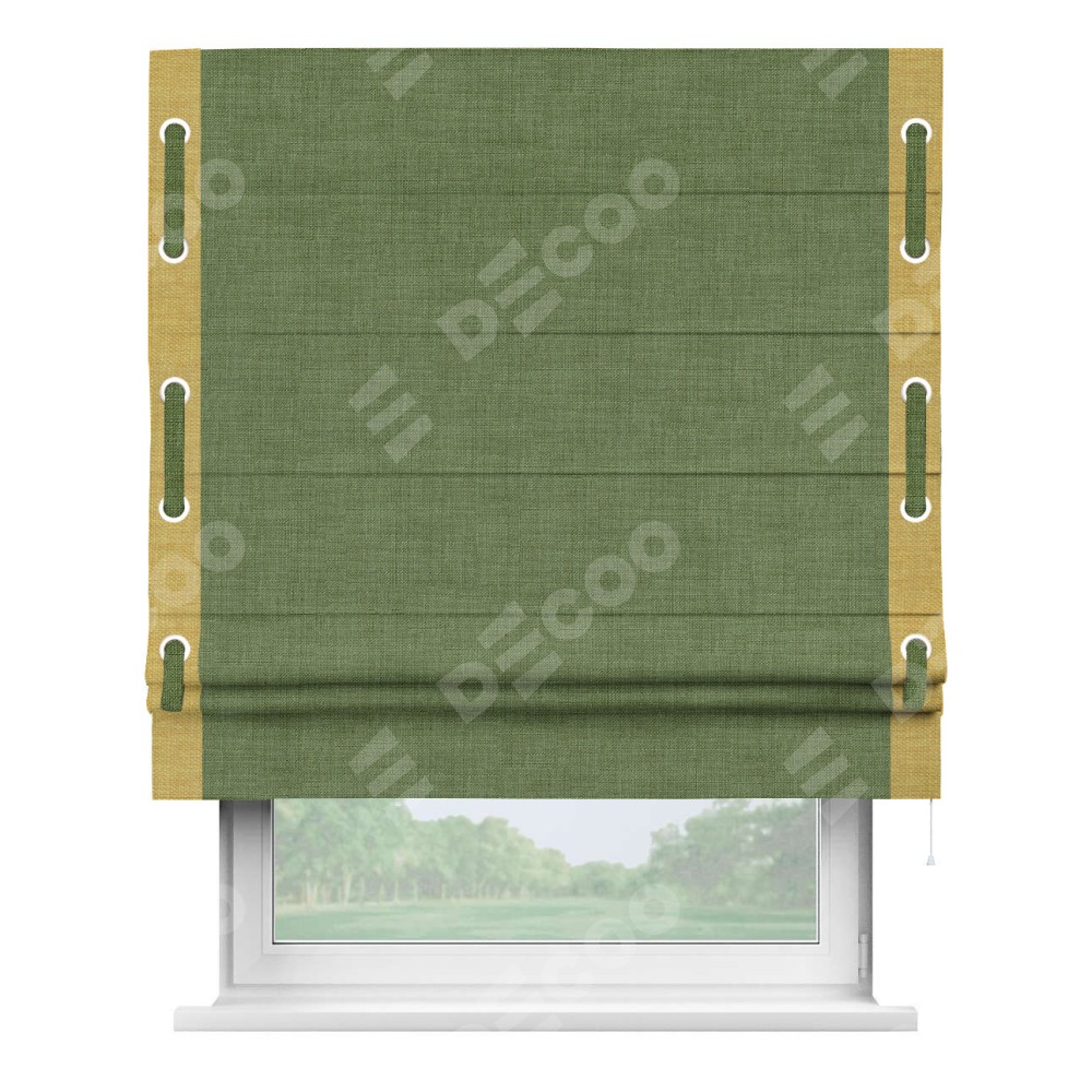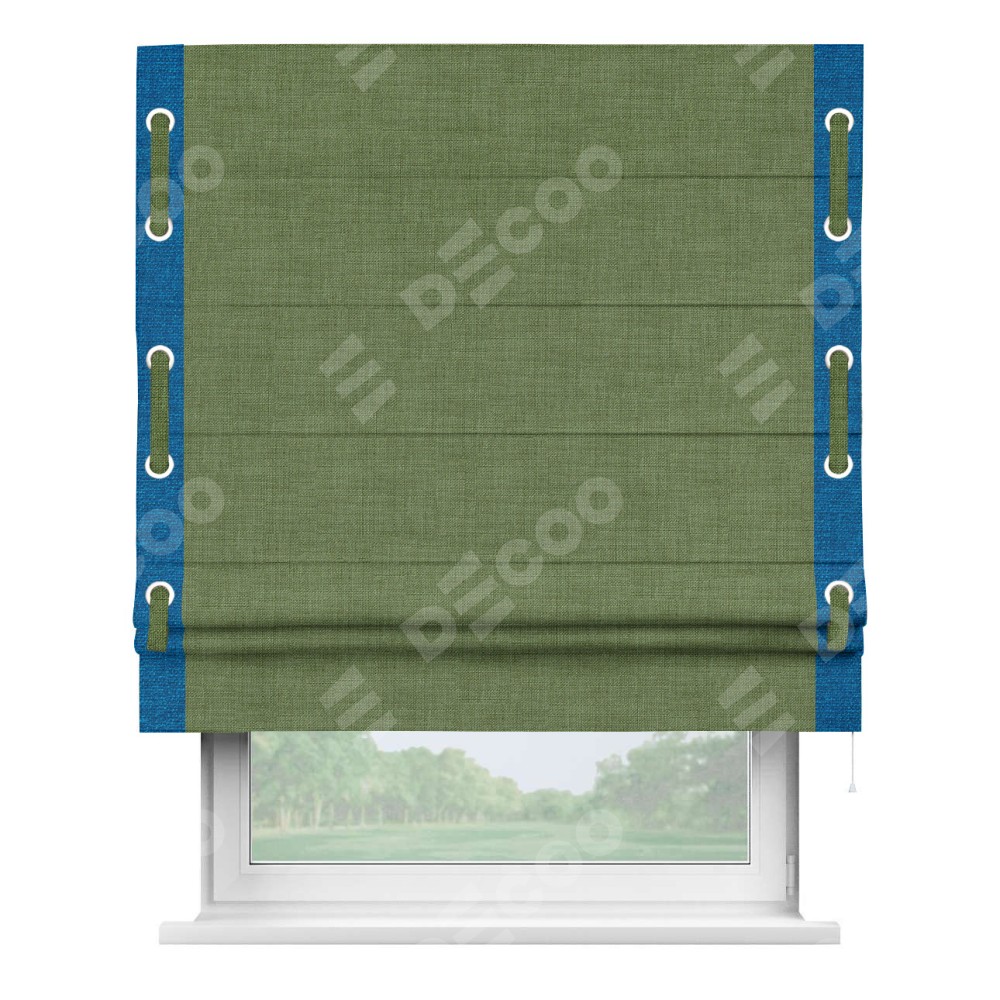 Классическая римская штора производителя «Cortin», пошита из ткани лён зелёный, артикул: 131547. Имеет универсальный механизм и подходит для монтажа: на потолок, на стену и в нишу.