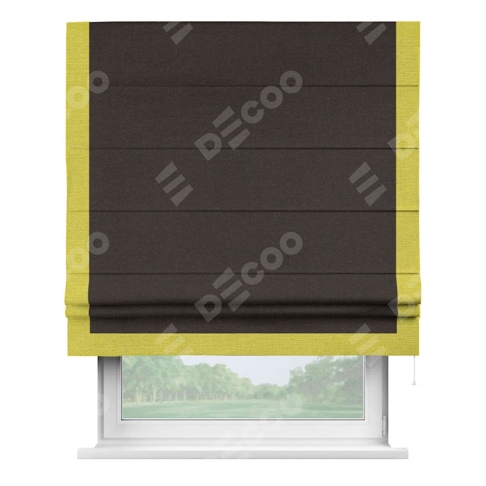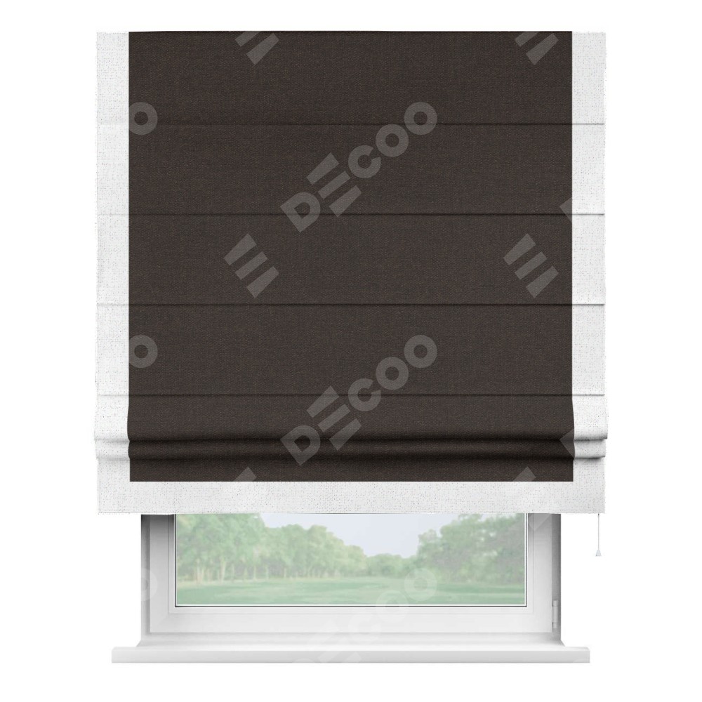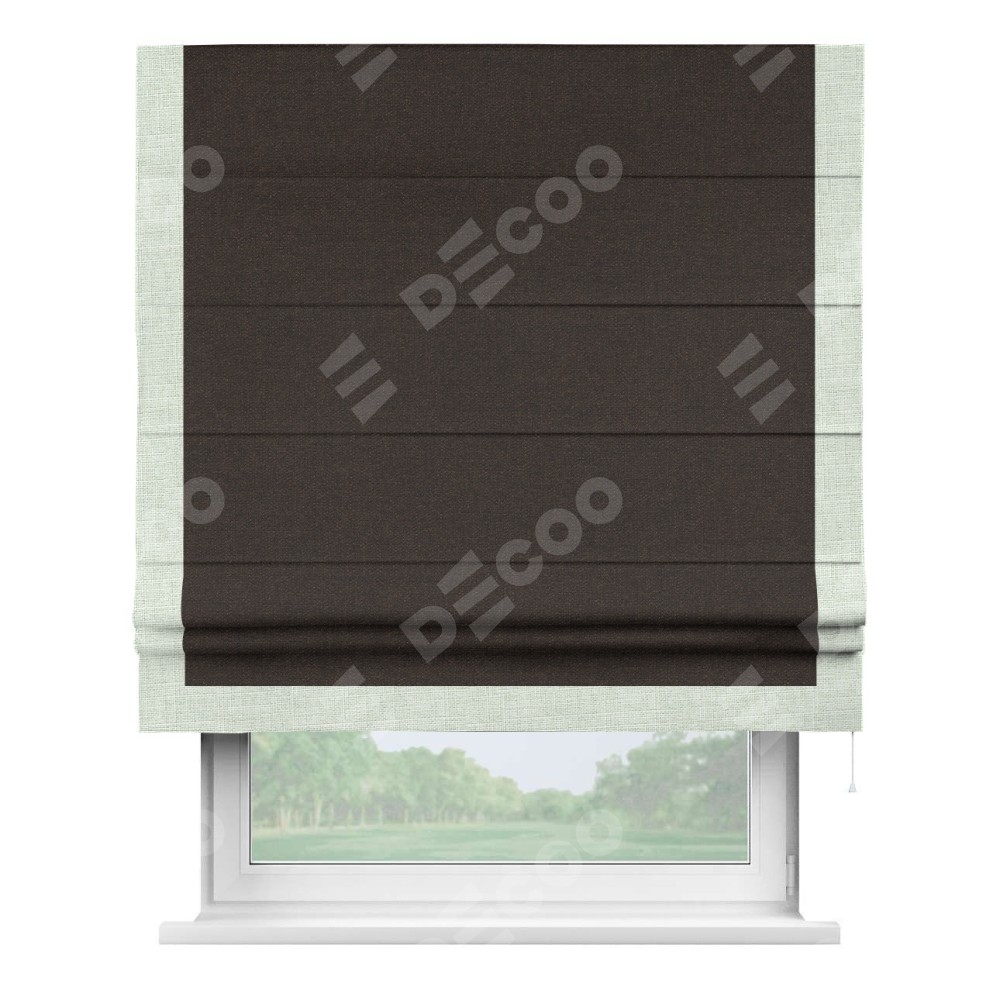 Классическая римская штора производителя «Cortin», пошита из ткани лён тёмно-коричневый, артикул: 104497. Имеет универсальный механизм и подходит для монтажа: на потолок, на стену и в нишу.