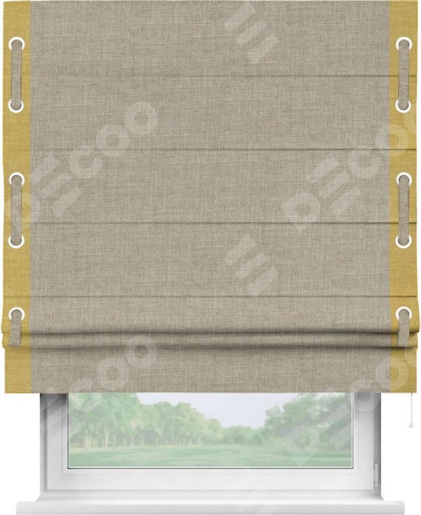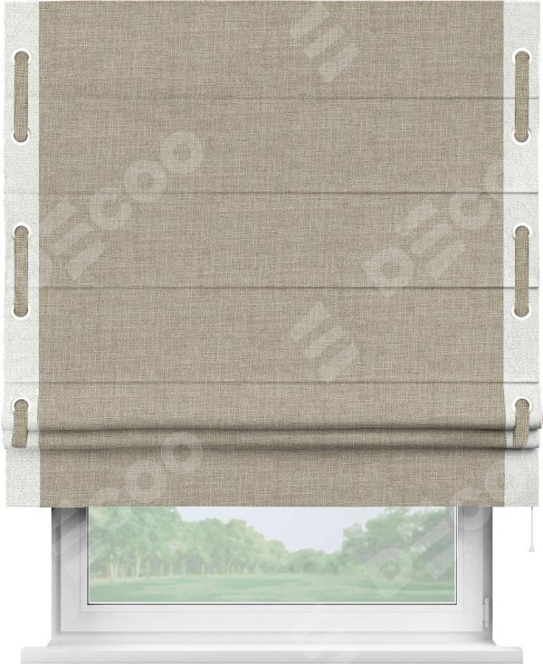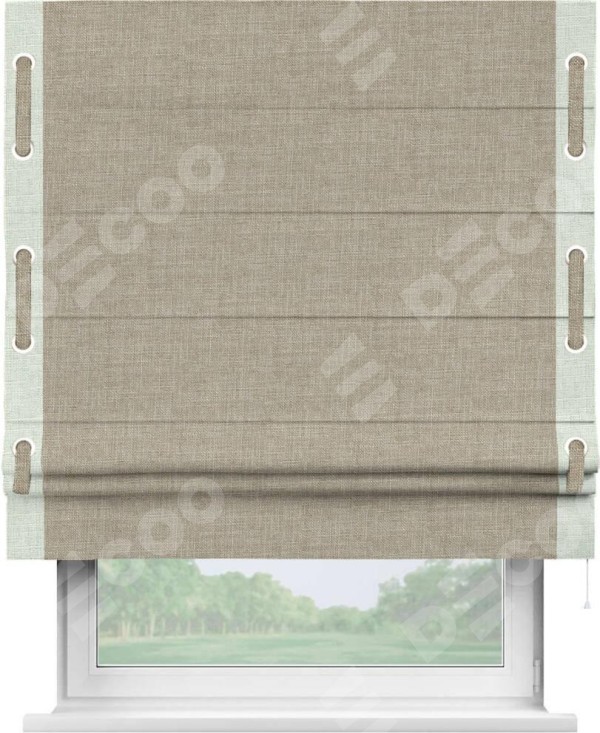 Римская штора «Кортин» для проёма, лён бежевый, с кантом Стрим Дуо (люверсы с пояском)