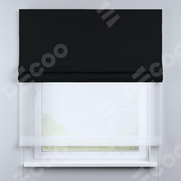 Двойная римская штора «День-ночь» от производителя Cortin предназначена для использования в проёмах. Эта штора уникальна тем, что состоит из двух полотен. На лицевой стороне находится однотонный блэкаут черный (артикул: 37), обеспечивающий эффективное затемнение. В комплект также входит вторая ткань — легкий белый тюль (артикул: V-01), который добавляет изящества и легкости оформлению окна. Кроме того, доступны и другие разновидности ткани тюль, выбор которых доступен по  ссылке .