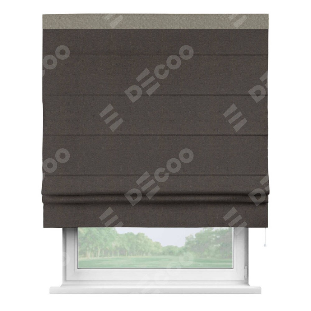 Римская штора производителя «Cortin», используется для проёма, пошита из ткани лён димаут венге, артикул 85410. Отделка шторы кантом «Кинг», ткань для канта используется из льна димаут разной расцветки на выбор. Имеет универсальный механизм и подходит для монтажа: на потолок, на стену и в нишу.