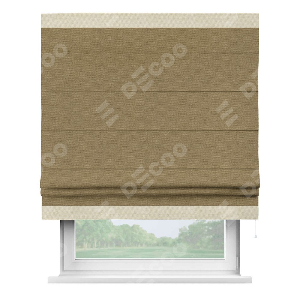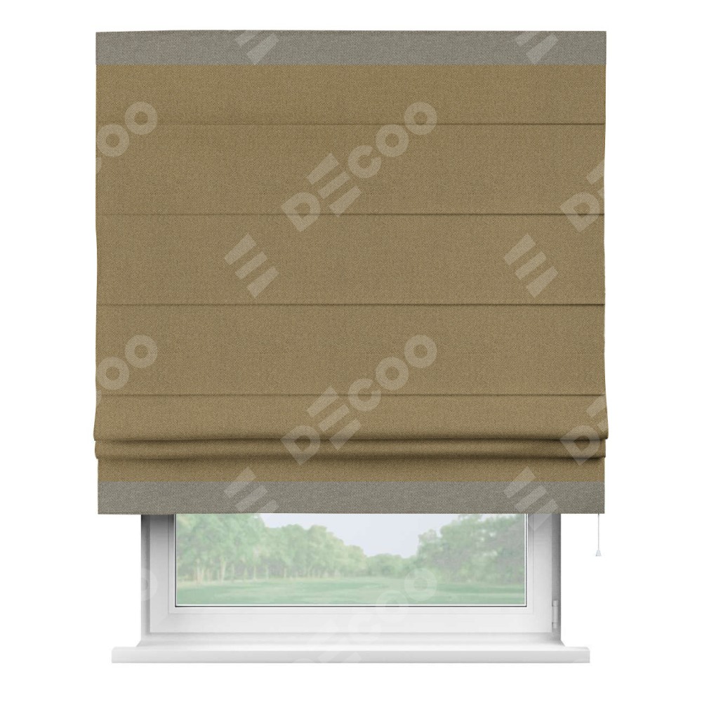 Римская штора производителя «Cortin», используется для проёма, пошита из ткани лён димаут оливковый, артикул 16243. Отделка шторы кантом «Горизонт», ткань для канта используется из льна димаут разной расцветки на выбор. Имеет универсальный механизм и подходит для монтажа: на потолок, на стену и в нишу.