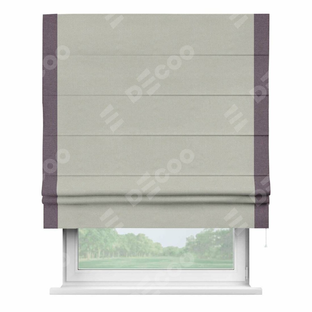 Римская штора производителя «Cortin», используется для проёма, пошита из ткани лён димаут светло-серый, артикул 83025. Отделка шторы кантом «Стрим Дуо», ткань для канта используется из льна димаут разной расцветки на выбор. Имеет универсальный механизм и подходит для монтажа: на потолок, на стену и в нишу.