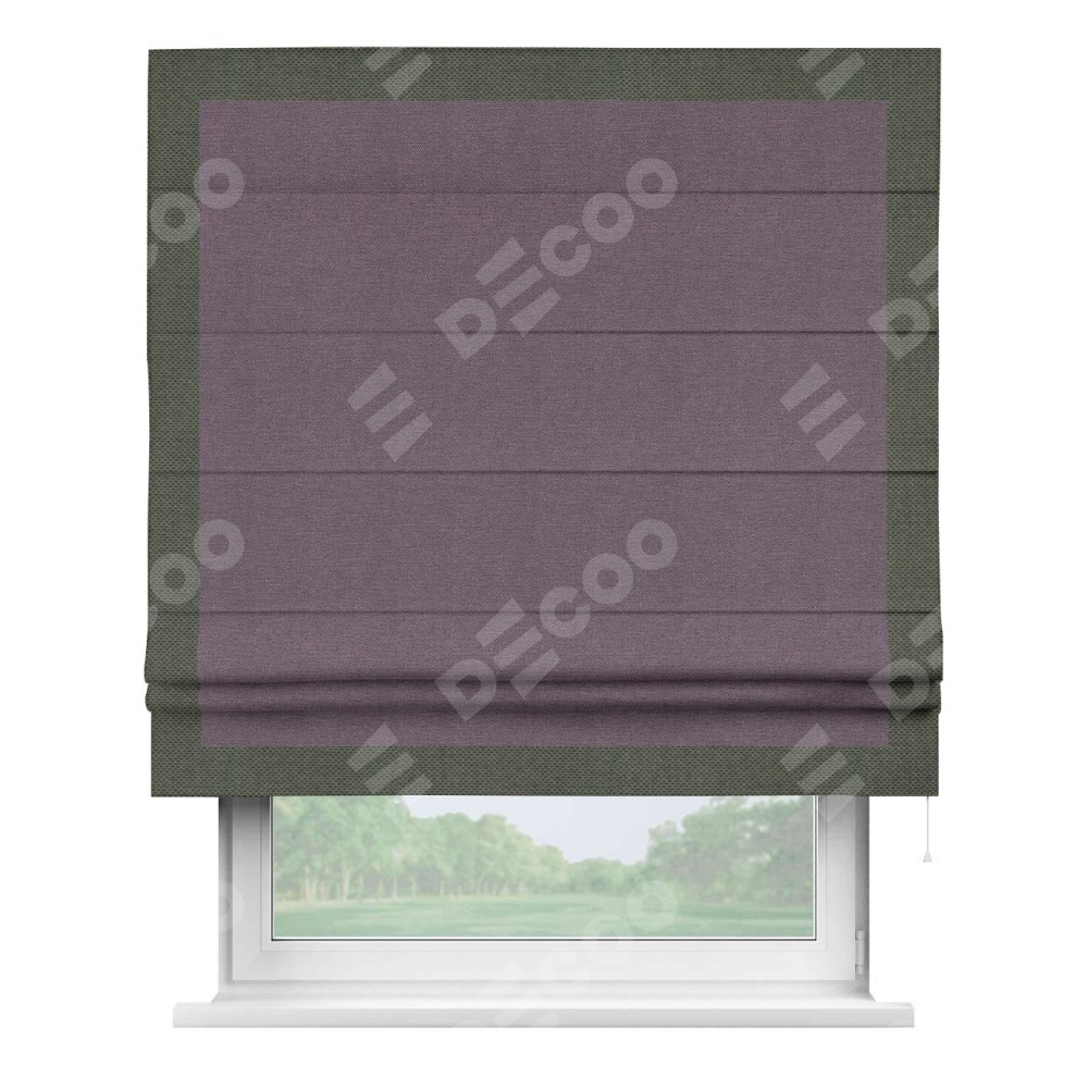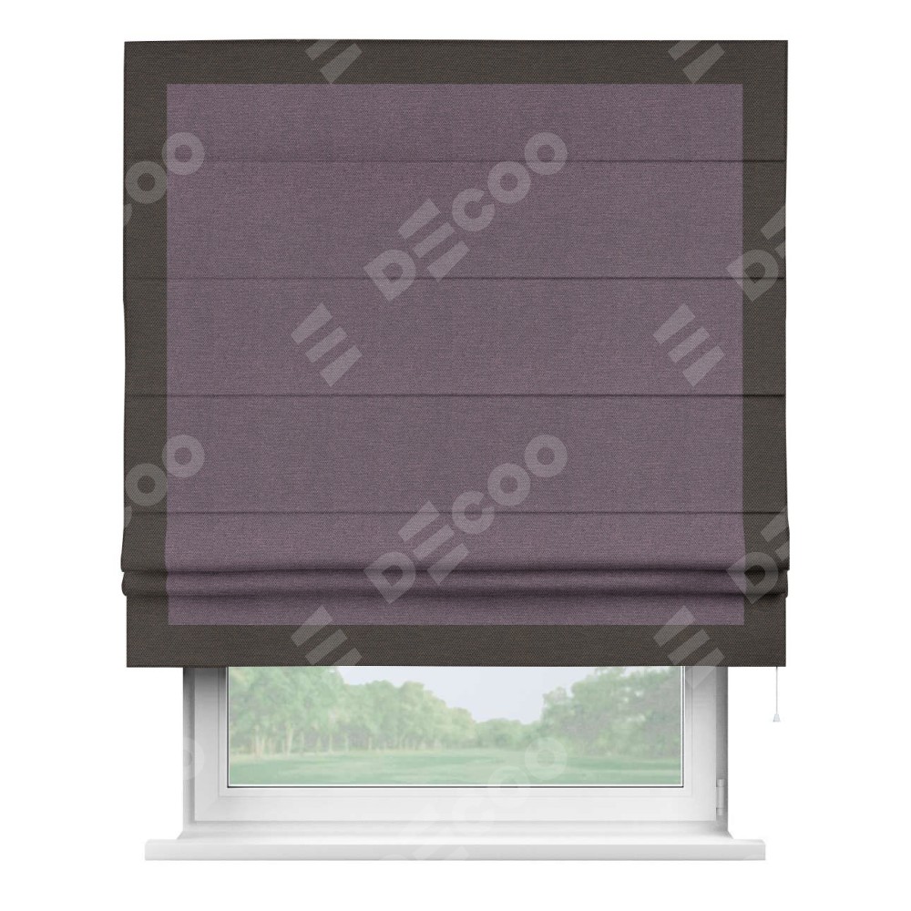 Римская штора производителя «Cortin», используется для проёма, пошита из ткани лён димаут светло-фиолетовый, артикул 83034. Отделка шторы кантом «Чесс», ткань для канта используется из льна димаут разной расцветки на выбор. Имеет универсальный механизм и подходит для монтажа: на потолок, на стену и в нишу.