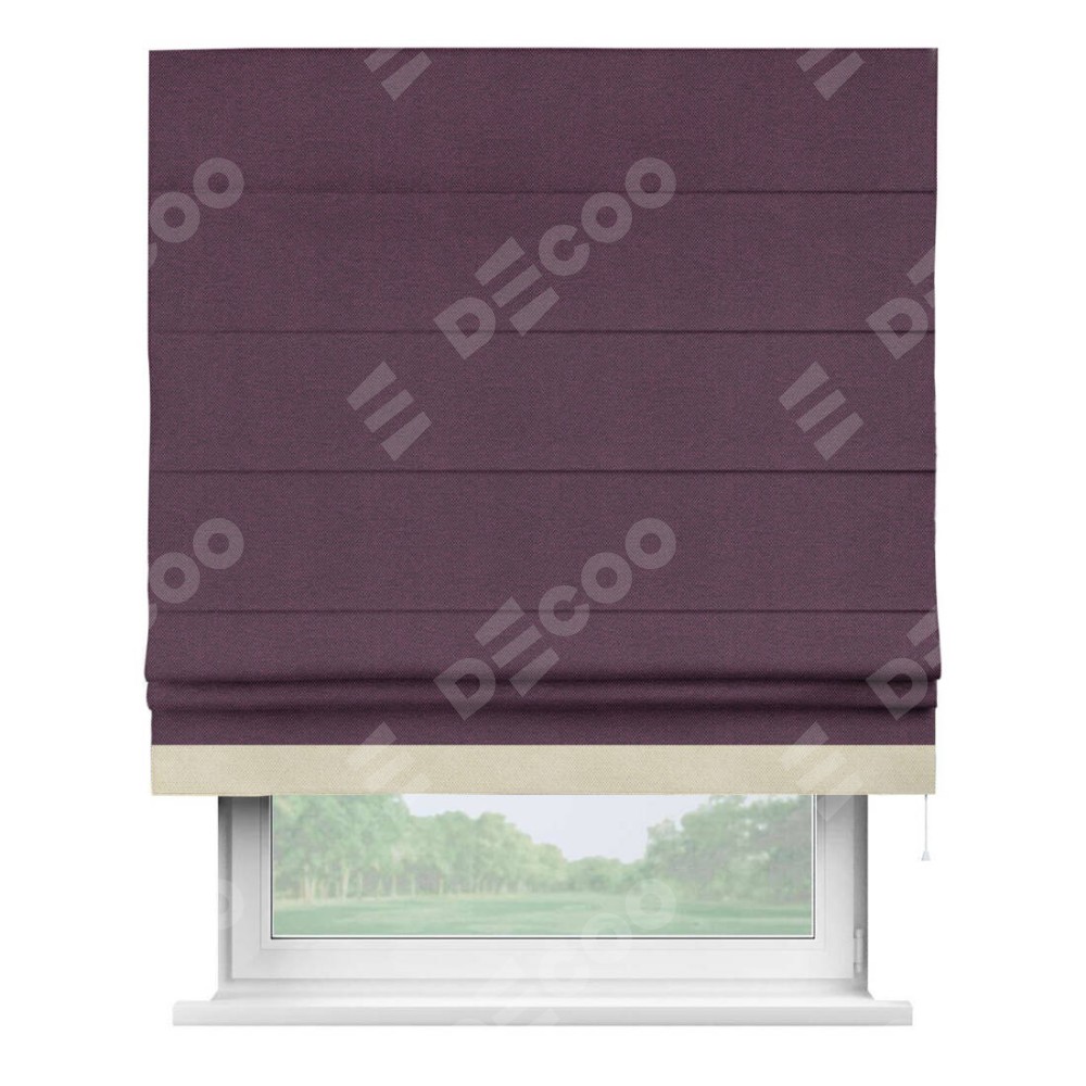 Римская штора производителя «Cortin», используется для проёма, пошита из ткани лён димаут фиолетовый, артикул 8817. Отделка шторы кантом «Джестер», ткань для канта используется из льна димаут разной расцветки на выбор. Имеет универсальный механизм и подходит для монтажа: на потолок, на стену и в нишу.