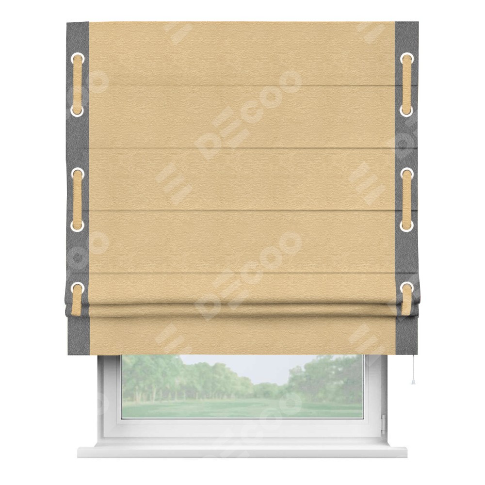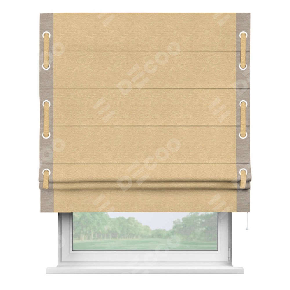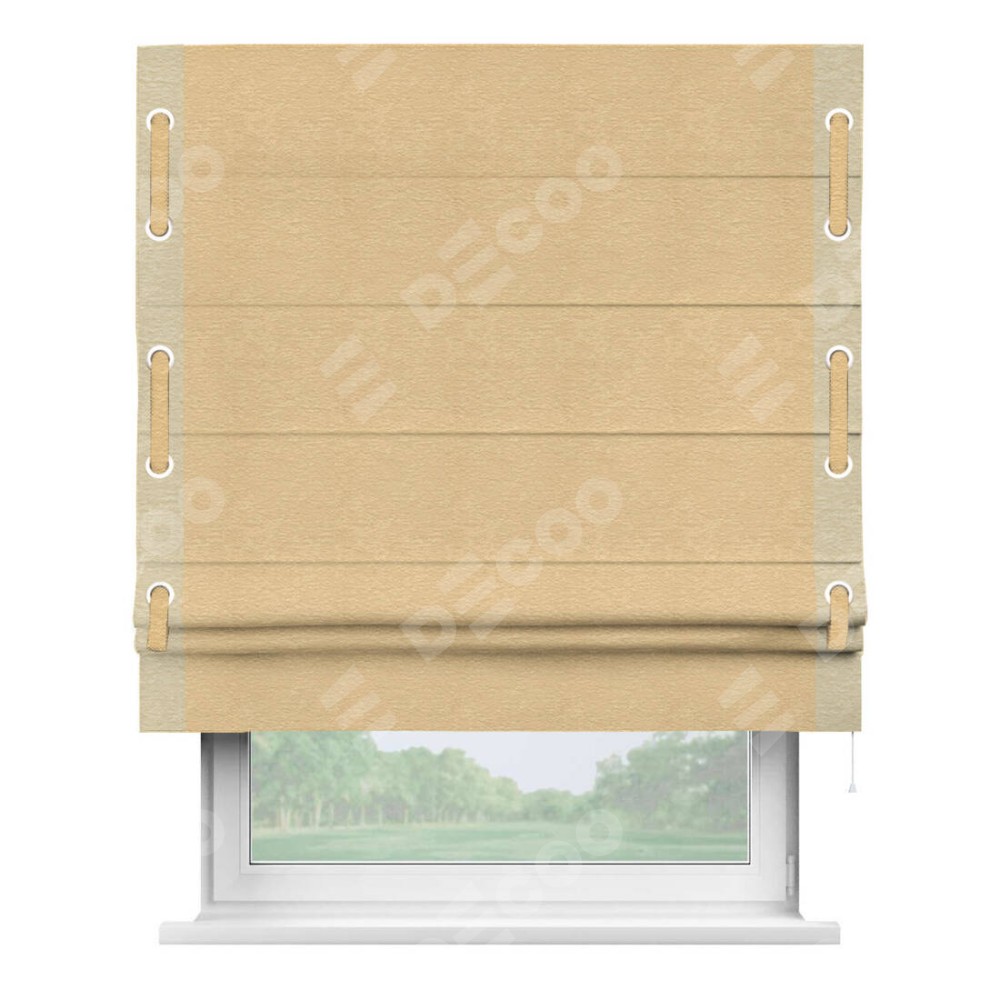 Римская штора производителя «Cortin», используется для проёма, пошита из ткани софт однотонный бежевый, артикул 4202 05. Отделка шторы кантом «Стрим Дуо» на кантах расположены люверсы с пояском, ткань для канта используется из софта разной расцветки на выбор. Ткань для пояска обычно используется из основной ткани шторы, а так же можно сделать из любой расцветки по желанию. Имеет универсальный механизм и подходит для монтажа: на потолок, на стену и в нишу.