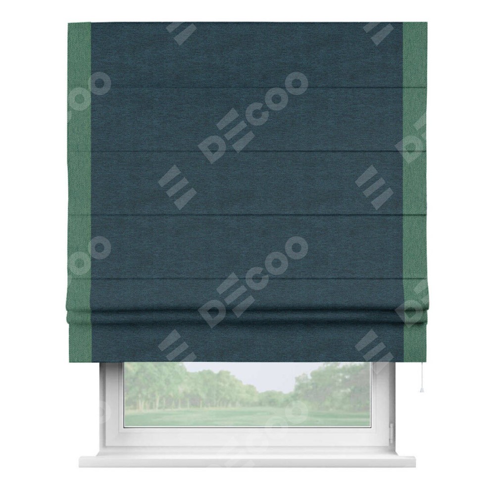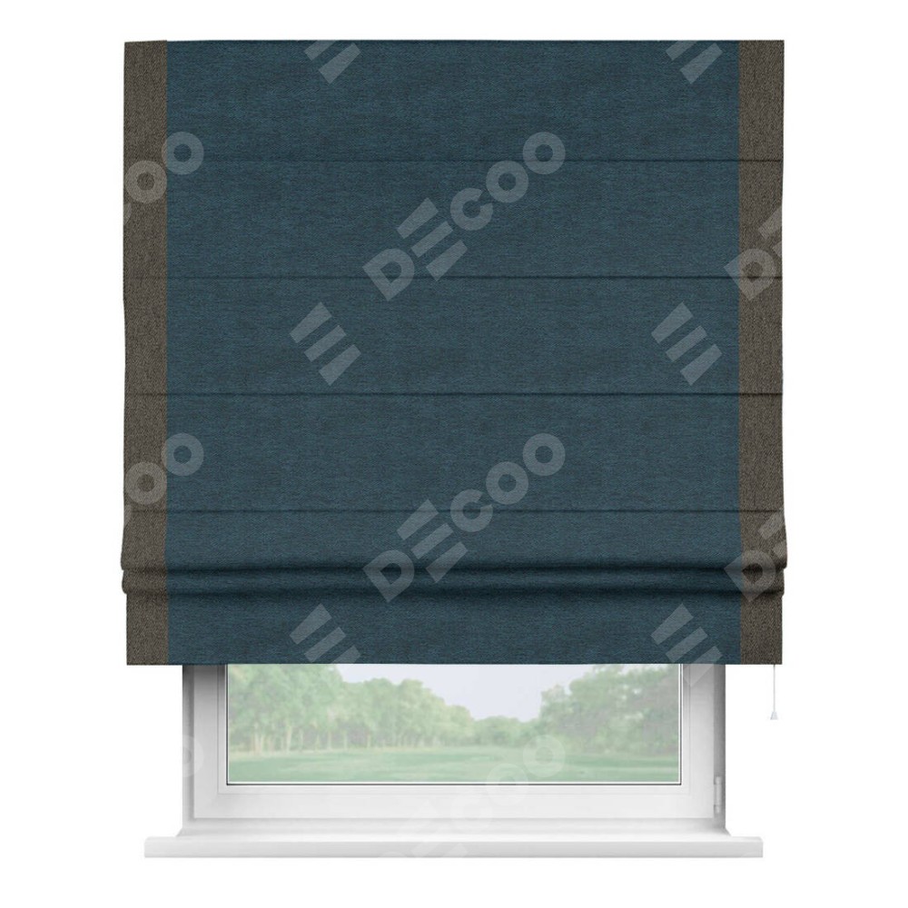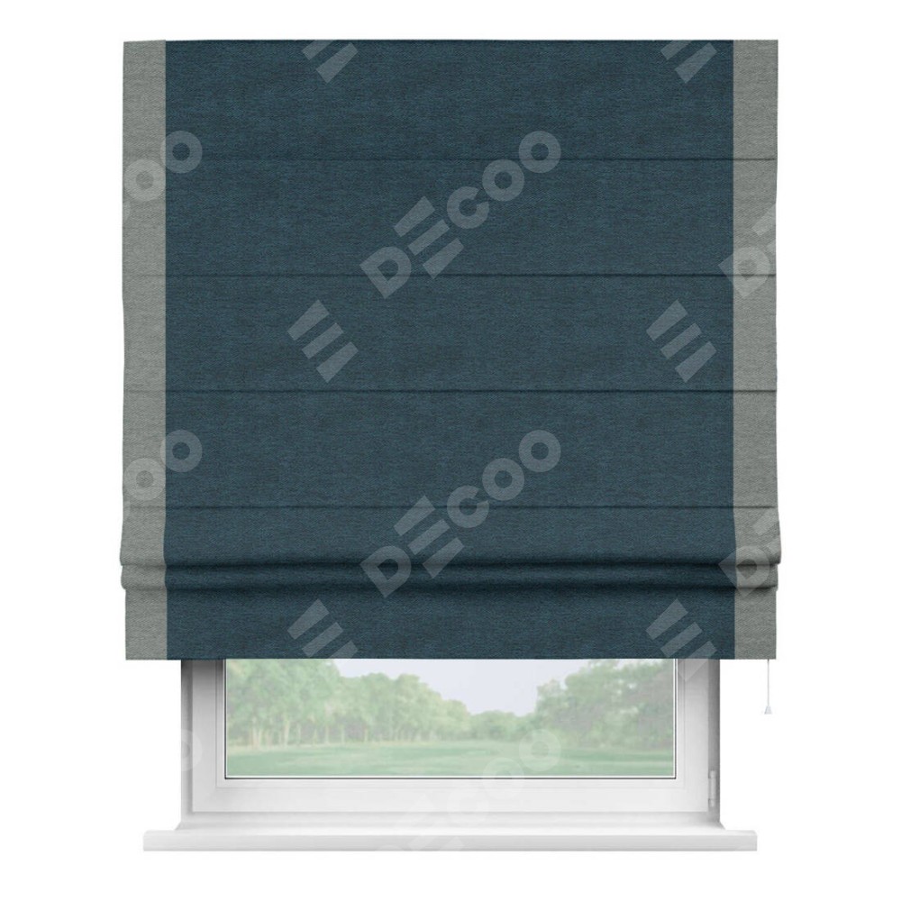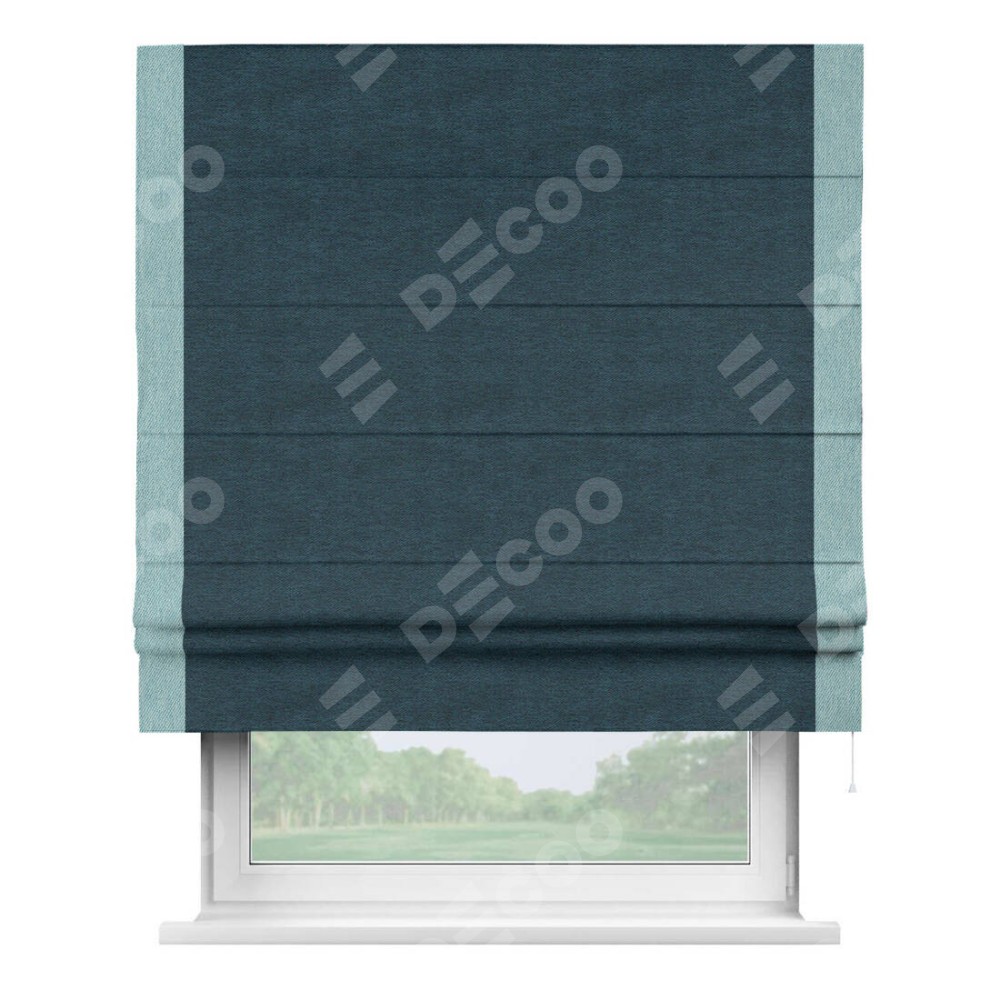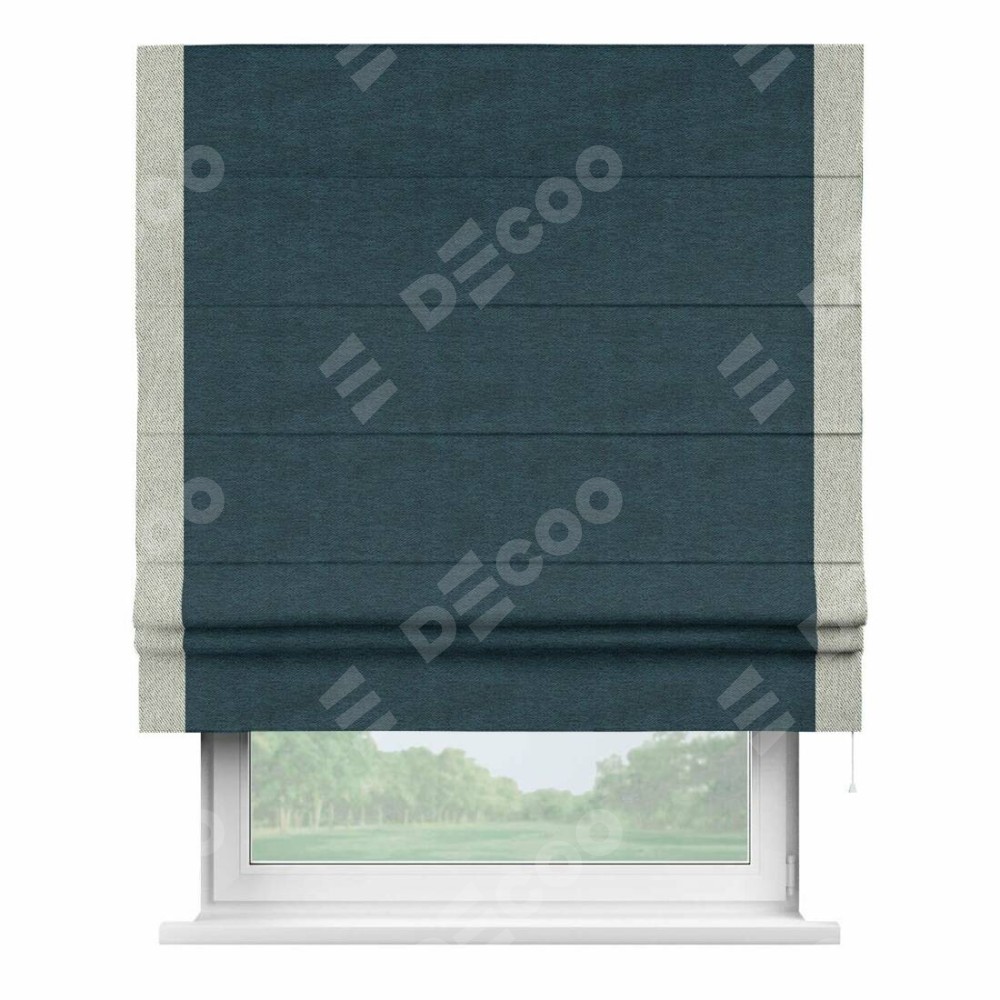Римская штора производителя «Cortin», используется для проёма, пошита из ткани твид блэкаут глубокий синий, артикул 21590. Отделка шторы кантом «Стрим Дуо», ткань для канта используется из твида разной расцветки на выбор. Имеет универсальный механизм и подходит для монтажа: на потолок, на стену и в нишу.