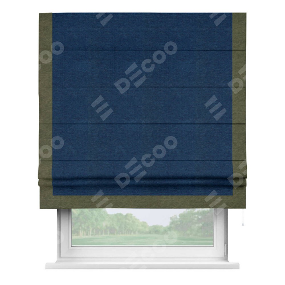 Римская штора производителя «Cortin», используется для проёма, пошита из ткани софт однотонный синий, артикул 42937. Отделка шторы кантом «Виктория», ткань для канта используется из софта разной расцветки на выбор. Имеет универсальный механизм и подходит для монтажа: на потолок, на стену и в нишу.