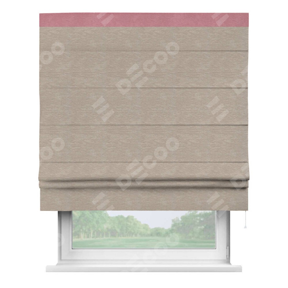 Римская штора производителя «Cortin», используется для проёма, пошита из ткани софт однотонный темно-бежевый, артикул 1640. Отделка шторы кантом «Кинг», ткань для канта используется из софта разной расцветки на выбор. Имеет универсальный механизм и подходит для монтажа: на потолок, на стену и в нишу.