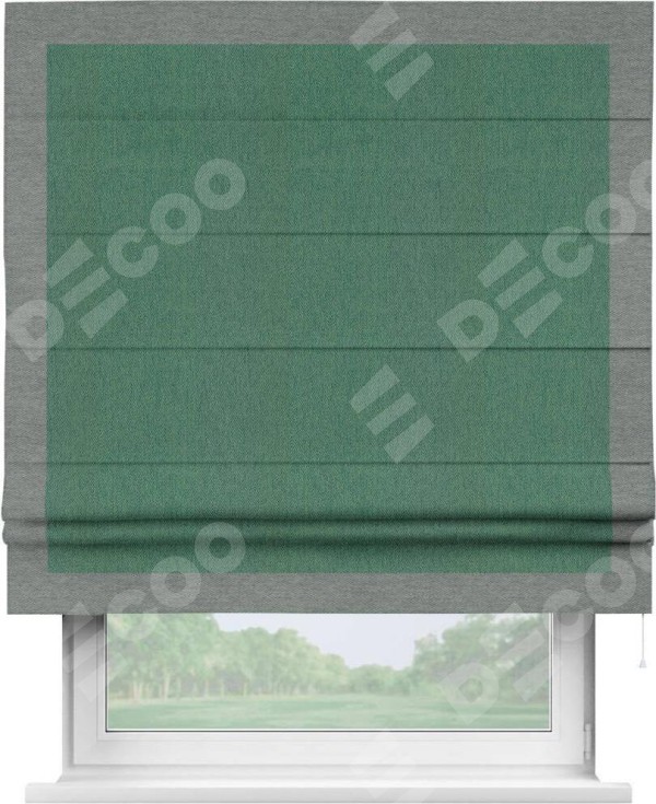 Римская штора производителя «Cortin», используется для проёма, пошита из ткани твид блэкаут зелёный, артикул 21589. Отделка шторы кантом «Чесс», ткань для канта используется из твида разной расцветки на выбор. Имеет универсальный механизм и подходит для монтажа: на потолок, на стену и в нишу.