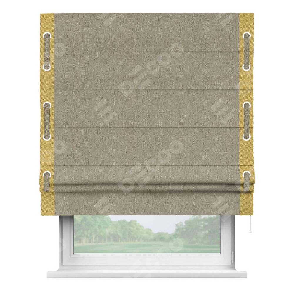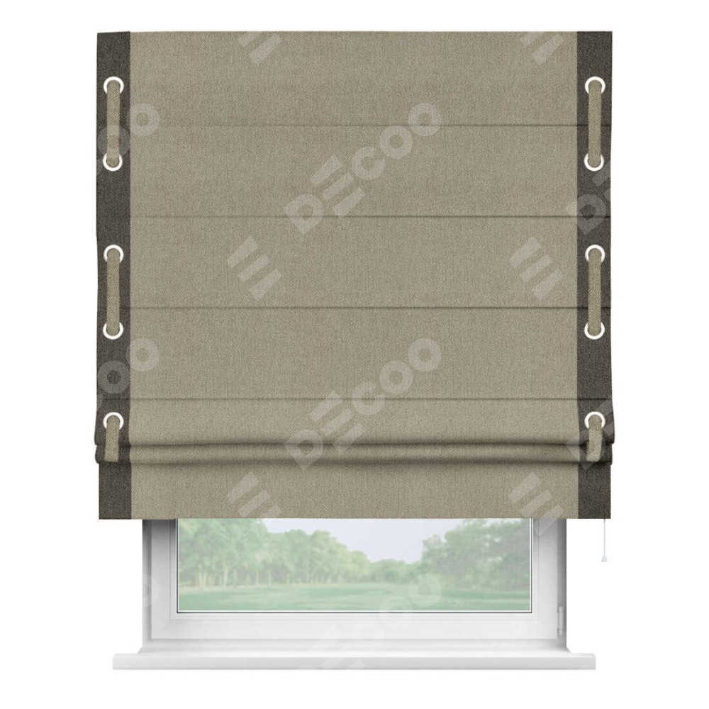 Римская штора производителя «Cortin», используется для проёма, пошита из ткани твид блэкаут кофе, артикул 21575. Отделка шторы кантом «Стрим Дуо» на кантах расположены люверсы с пояском, ткань для канта используется из твида разной расцветки на выбор. Ткань для пояска обычно используется из основной ткани шторы, а так же можно сделать из любой расцветки по желанию. Имеет универсальный механизм и подходит для монтажа: на потолок, на стену и в нишу.