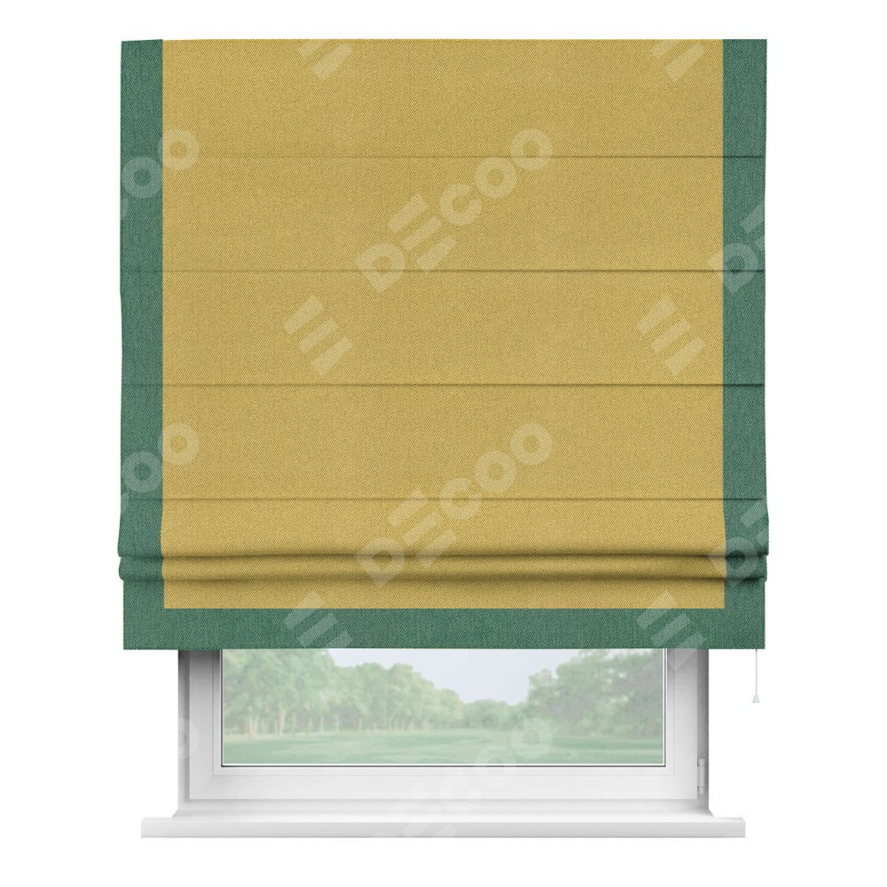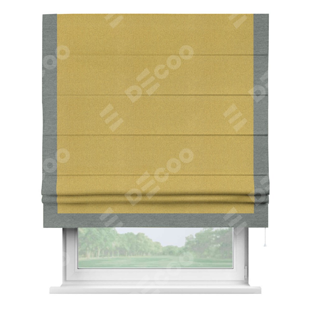 Римская штора производителя «Cortin», используется для проёма, пошита из ткани твид блэкаут пыльная горчица, артикул 21588. Отделка шторы кантом «Виктория», ткань для канта используется из твида разной расцветки на выбор. Имеет универсальный механизм и подходит для монтажа: на потолок, на стену и в нишу.