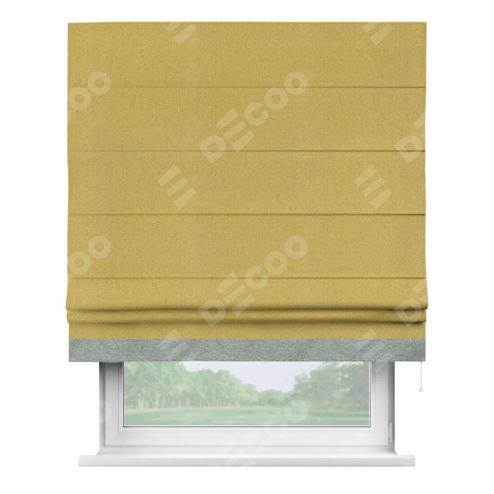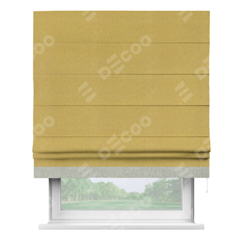 Римская штора производителя «Cortin», используется для проёма, пошита из ткани твид блэкаут пыльная горчица, артикул 21588. Отделка шторы кантом «Джестер», ткань для канта используется из твида разной расцветки на выбор. Имеет универсальный механизм и подходит для монтажа: на потолок, на стену и в нишу.