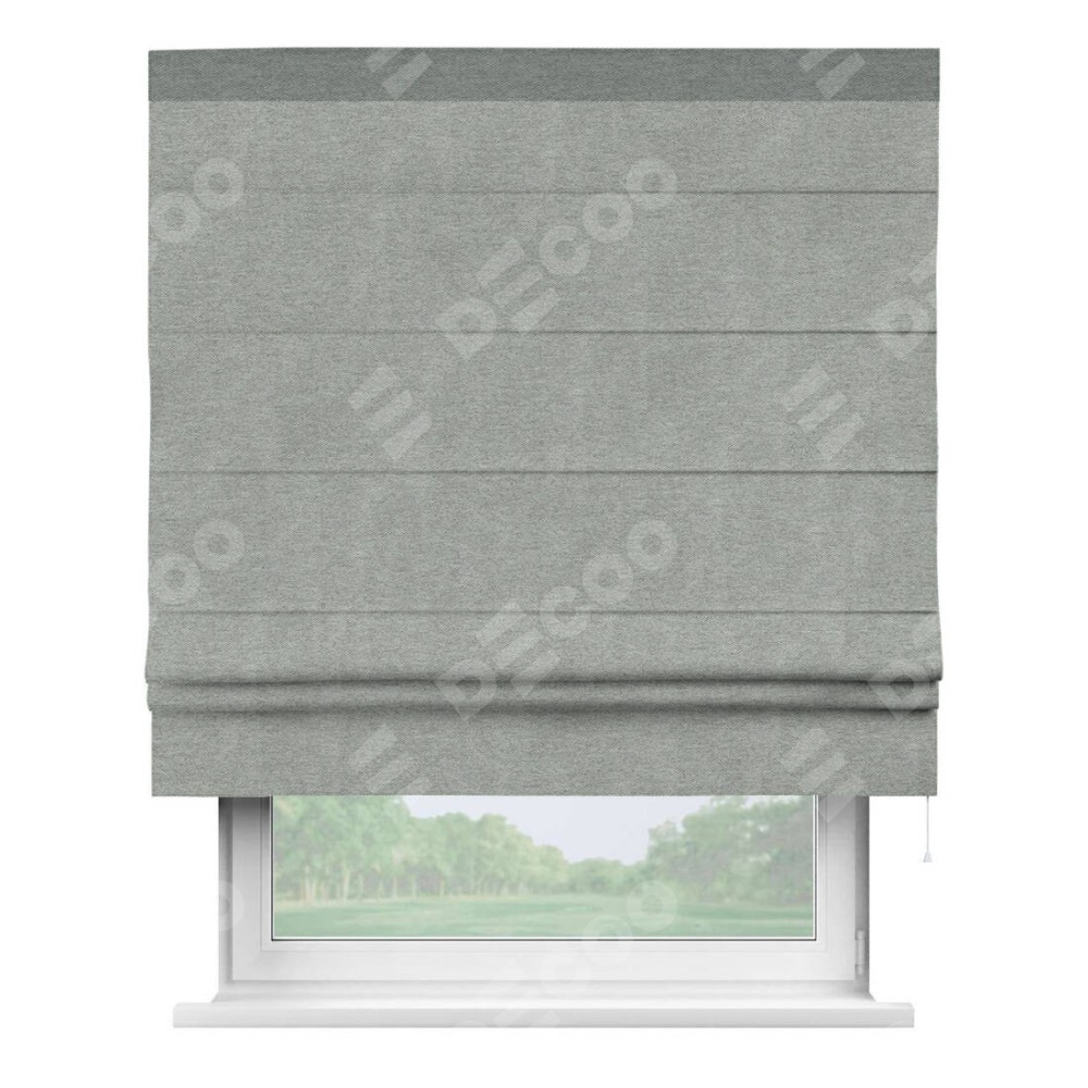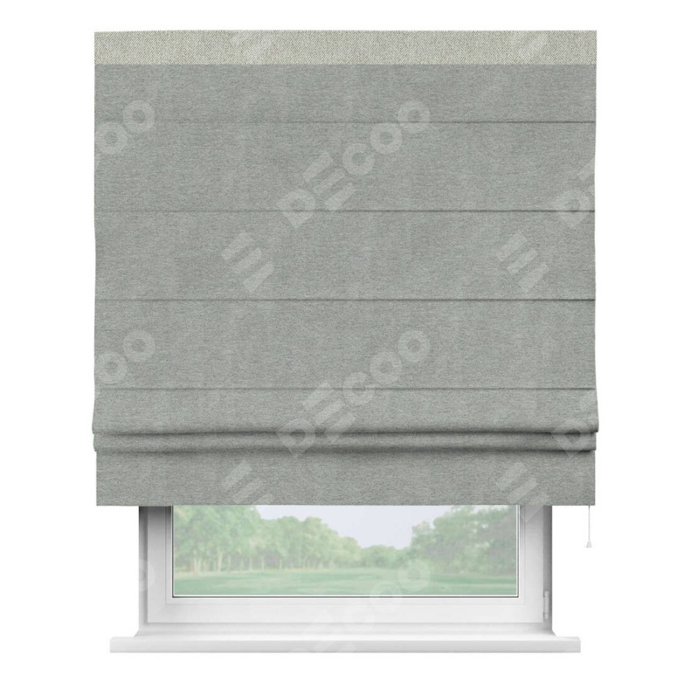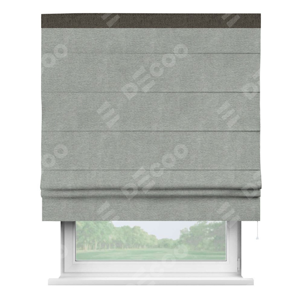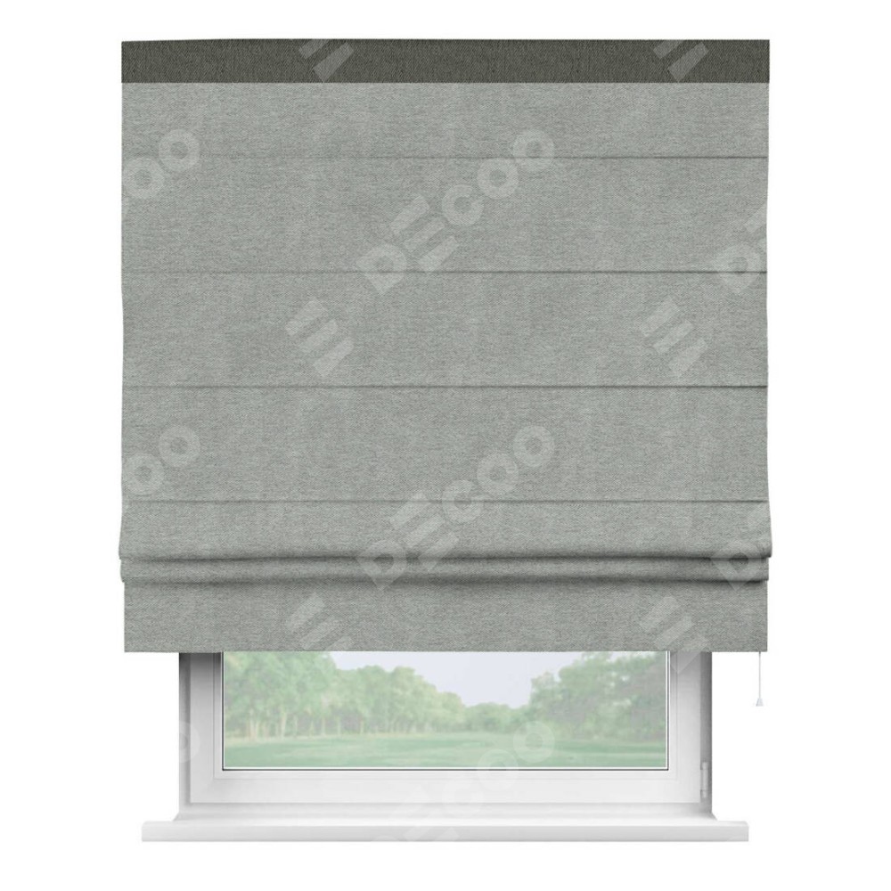 Римская штора производителя «Cortin», используется для проёма, пошита из ткани твид блэкаут светло-серый, артикул 21576. Отделка шторы кантом «Кинг», ткань для канта используется из твида разной расцветки на выбор. Имеет универсальный механизм и подходит для монтажа: на потолок, на стену и в нишу.