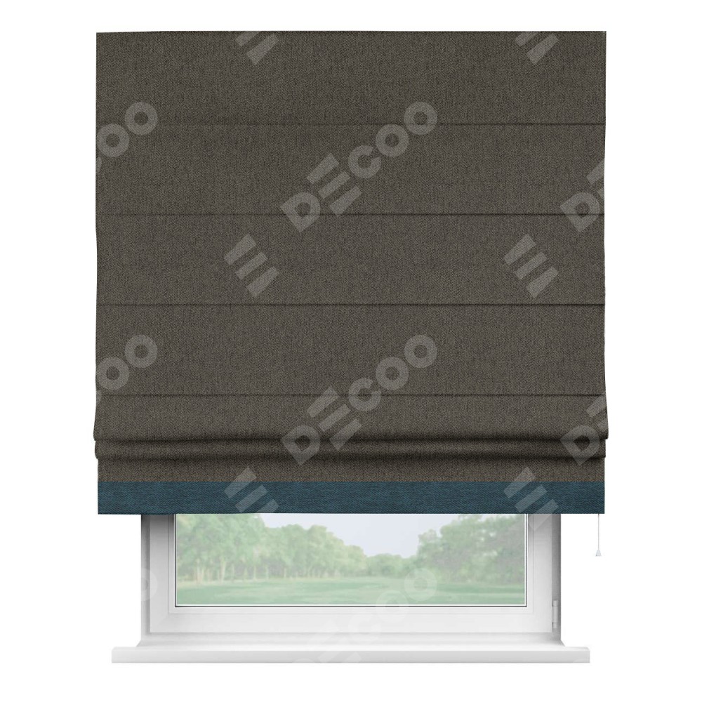 Римская штора производителя «Cortin», используется для проёма, пошита из ткани твид блэкаут тёмно-коричневый, артикул 21584. Отделка шторы кантом «Джестер», ткань для канта используется из твида разной расцветки на выбор. Имеет универсальный механизм и подходит для монтажа: на потолок, на стену и в нишу.