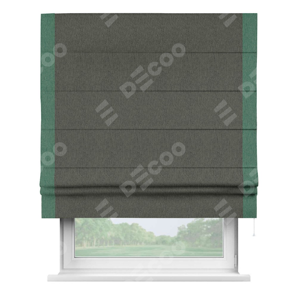 Римская штора производителя «Cortin», используется для проёма, пошита из ткани твид блэкаут тёмно-серый, артикул 21587. Отделка шторы кантом «Стрим Дуо», ткань для канта используется из твида разной расцветки на выбор. Имеет универсальный механизм и подходит для монтажа: на потолок, на стену и в нишу.