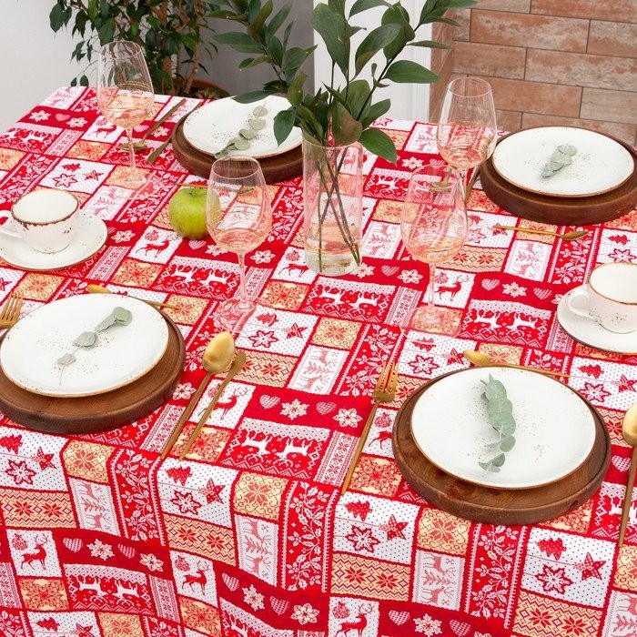 Скатерть от торговой марки «„Доляна“» украсит праздничный интерьер. Изделия с эксклюзивным принтом сшито из хлопкового полотна. Этот материал имеет плотную и упругую структуру, обладает высокой прочностью и на ура справляется с первостепенными задачами: