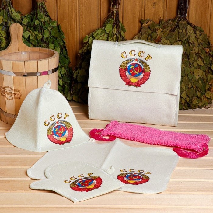 Набор для бани и сауны 5 в 1(сумка,шапка,варежка,коврик,мочалка),с принтом «СССР», белый